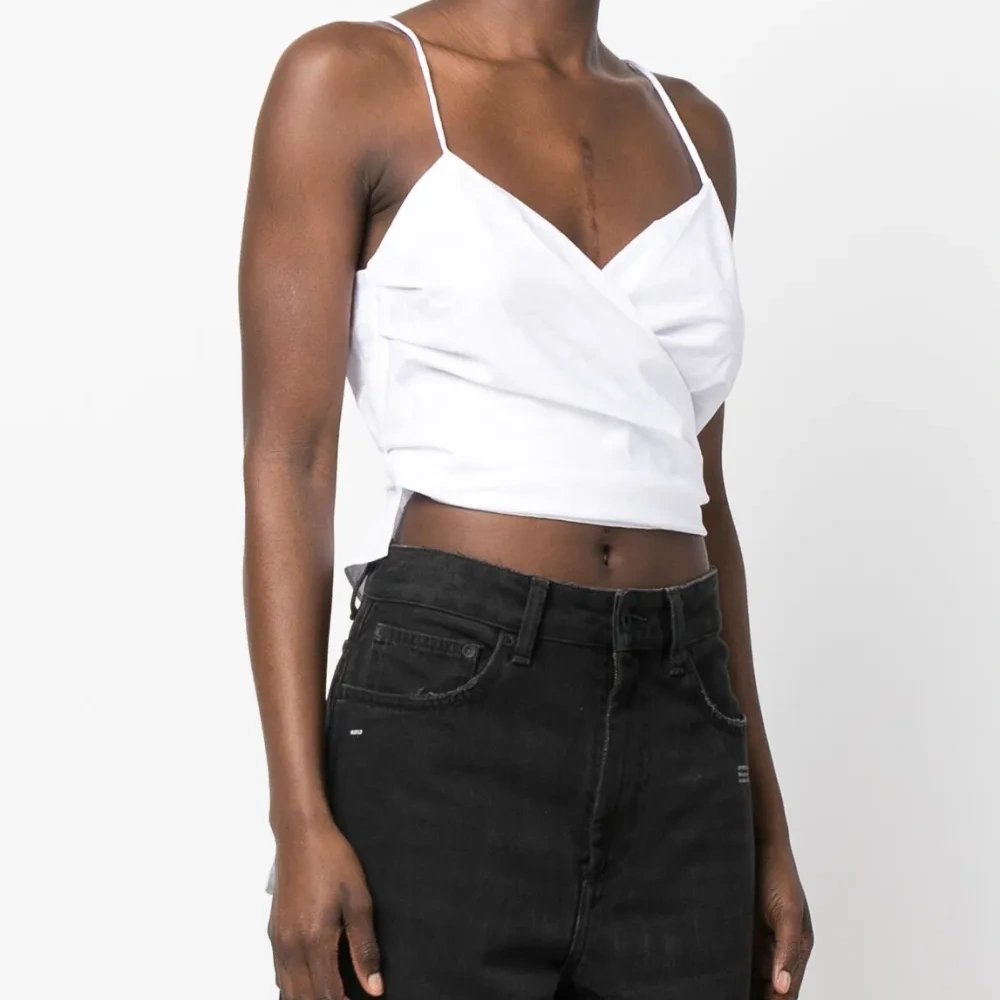 Белый, хлопок, несколько оборотов, V-образный вырез, тонкие бретели и шнуровка сзади.
