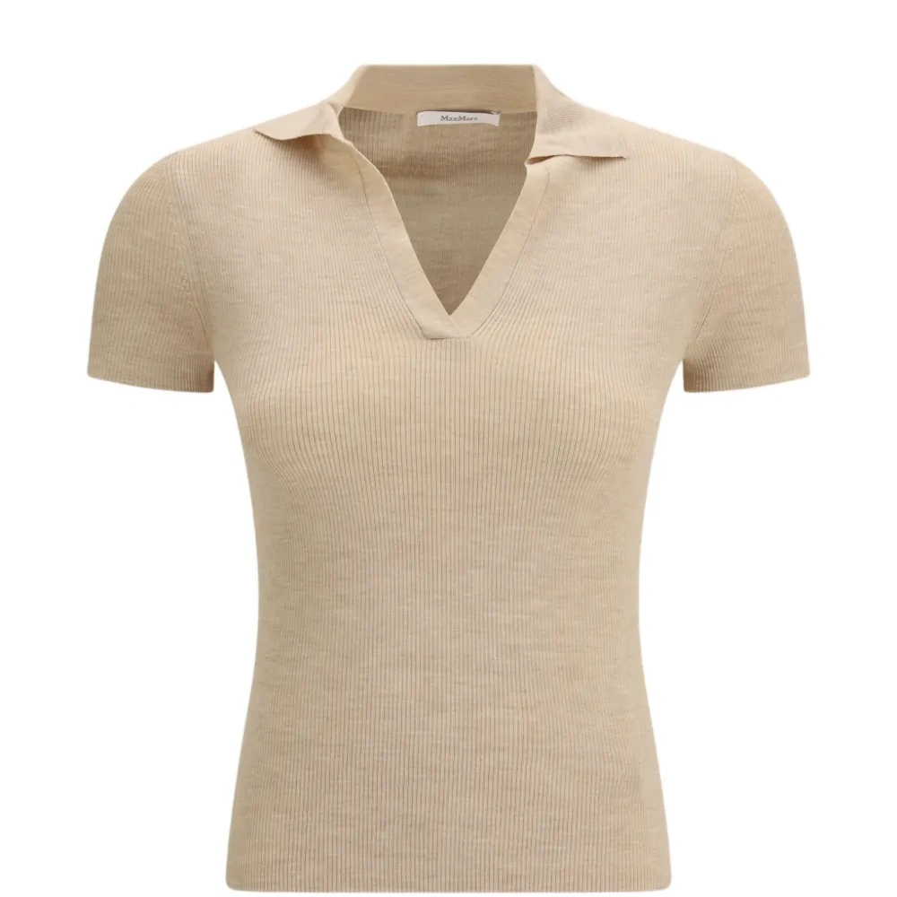 бежевый вязаный поло с ребристой текстурой и короткими рукавами
