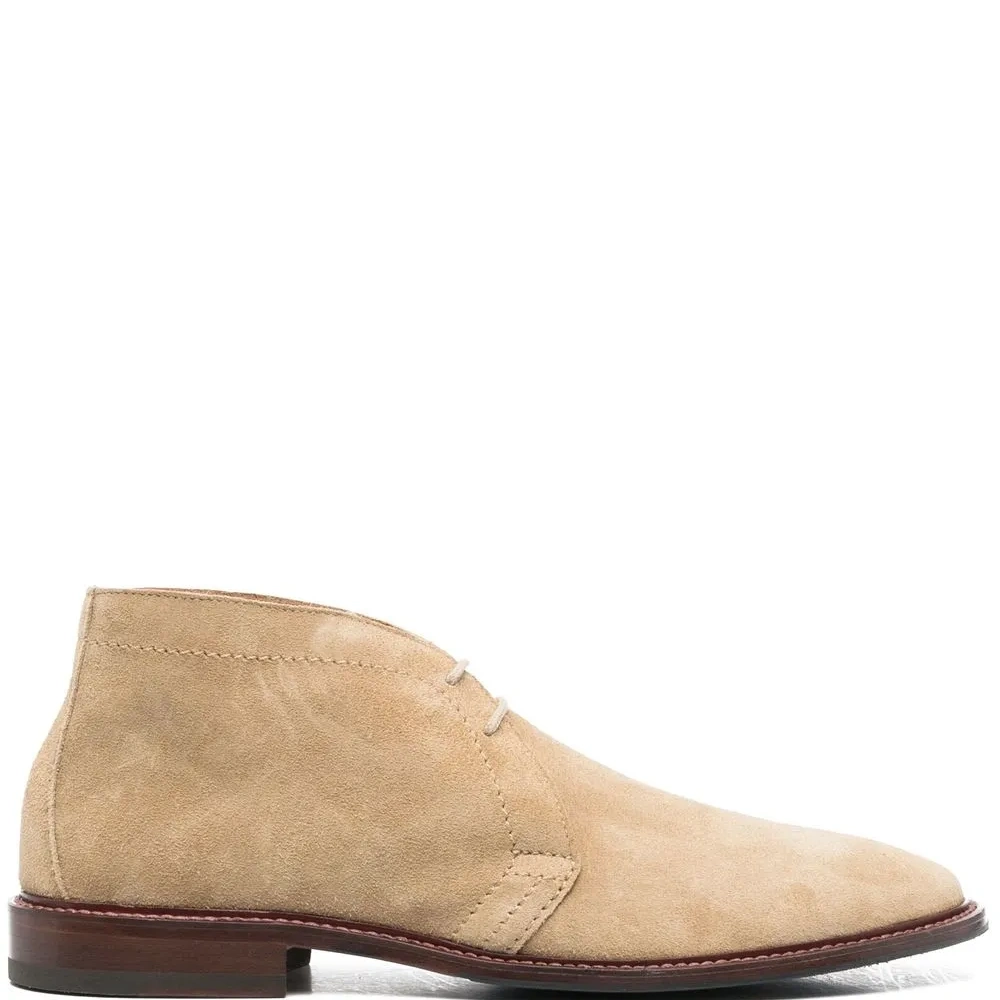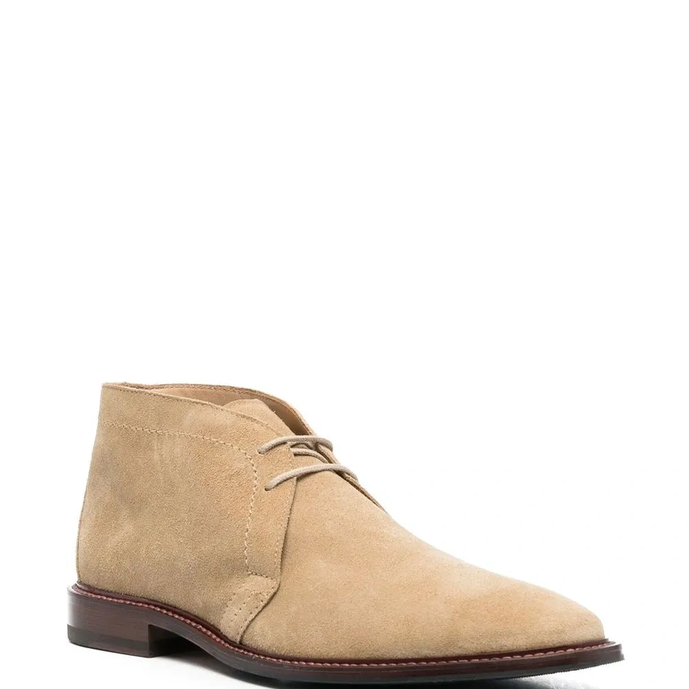 Светло-бежевый, замша из телячьей кожи, телячья кожа, высота по щиколотку, миндалевидный носок, шнуровка спереди, низкий блочный каблук и кожаная стелька с логотипом.