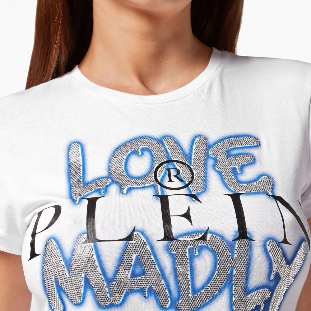 Белый/разноцветный, хлопок, декор из кристаллов, принт граффити, логотип спереди, бирка с логотипом, круглый вырез, короткие рукава и прямой подол.