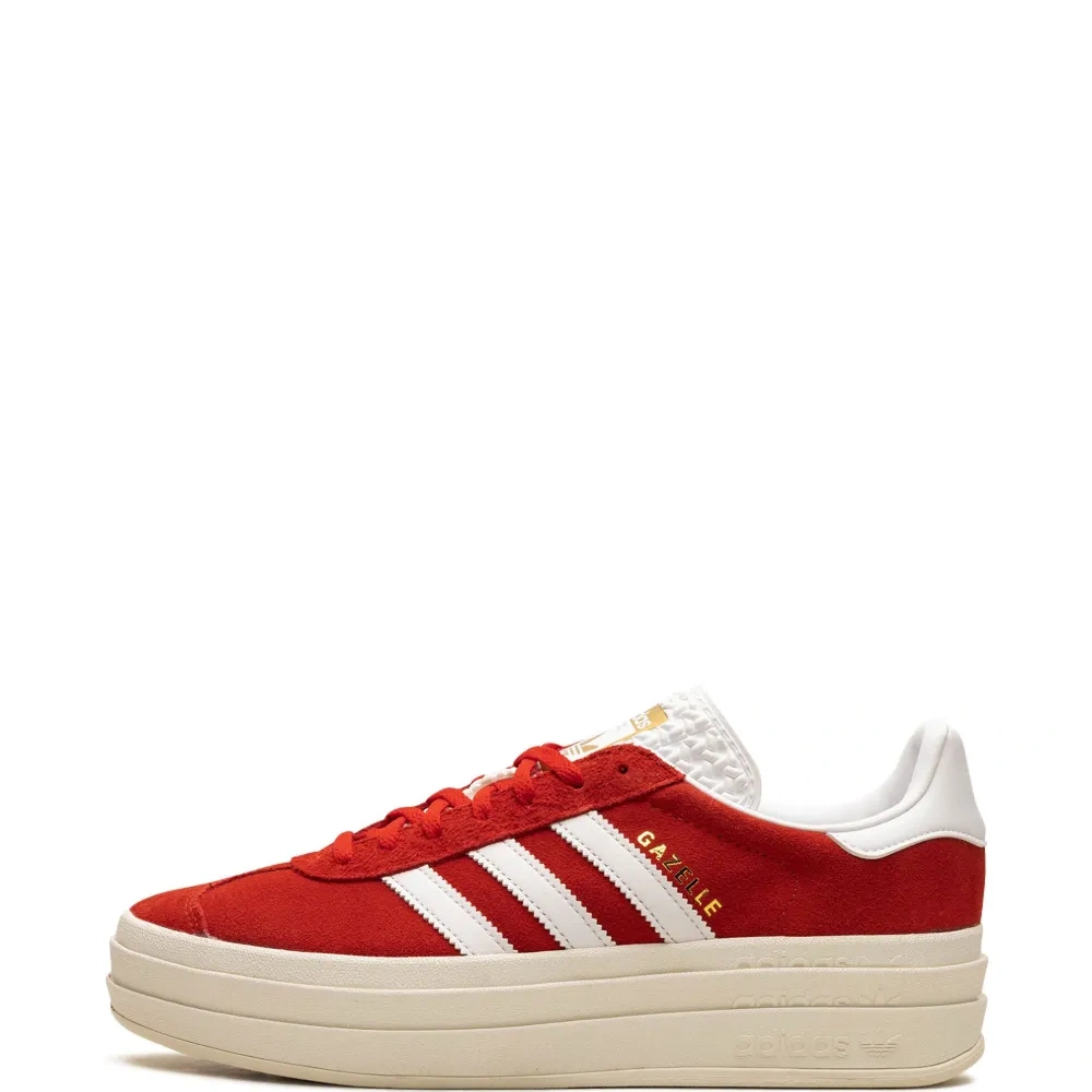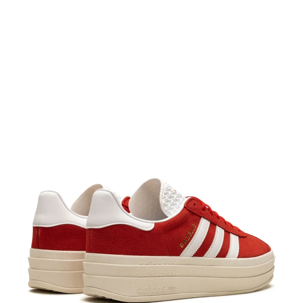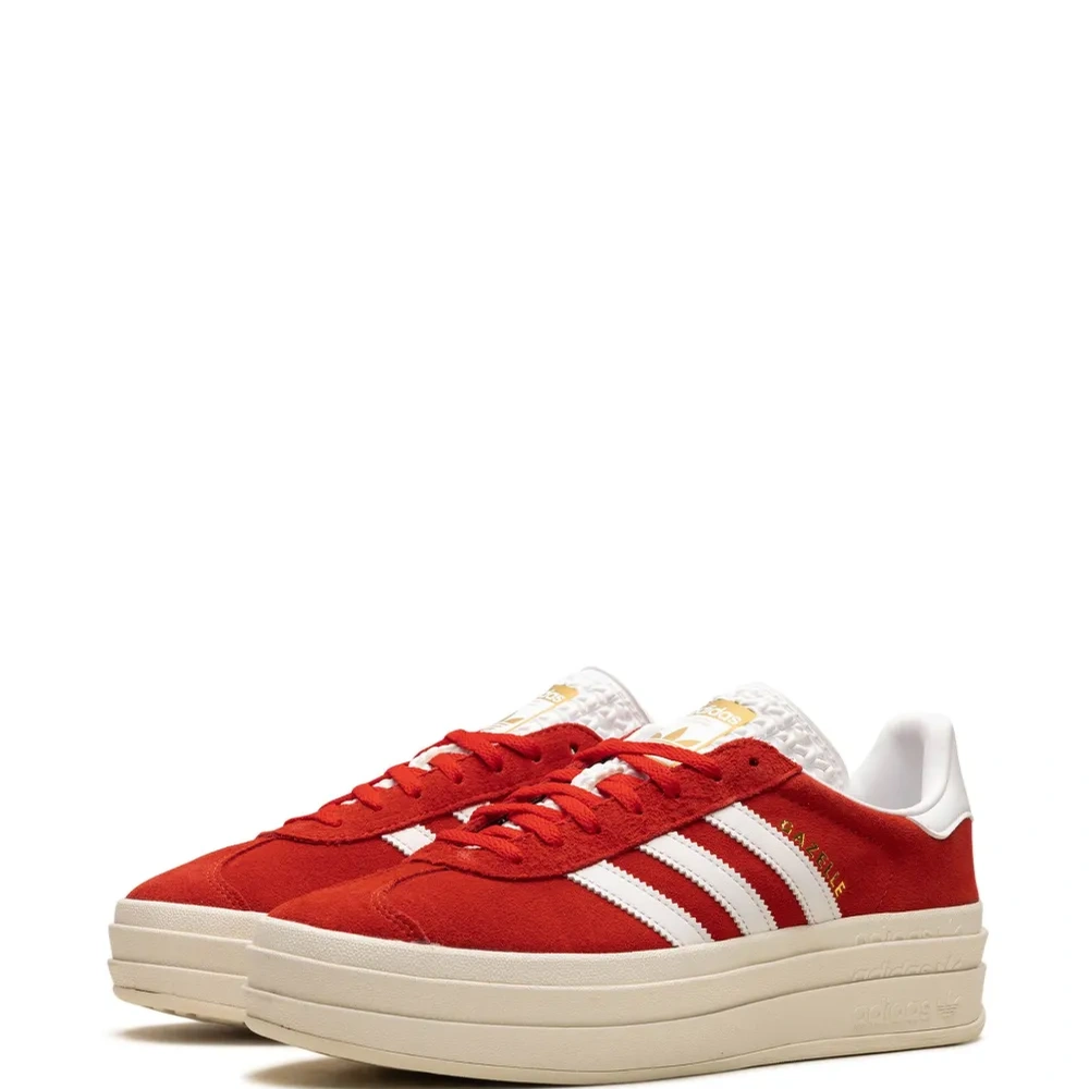 Насыщенно-красный, белый, замша из телячьей кожи, знаковый логотип 3-Stripes, язычок с логотипом, стелька с логотипом, закругленный носок, шнуровка спереди и подошва на платформе.