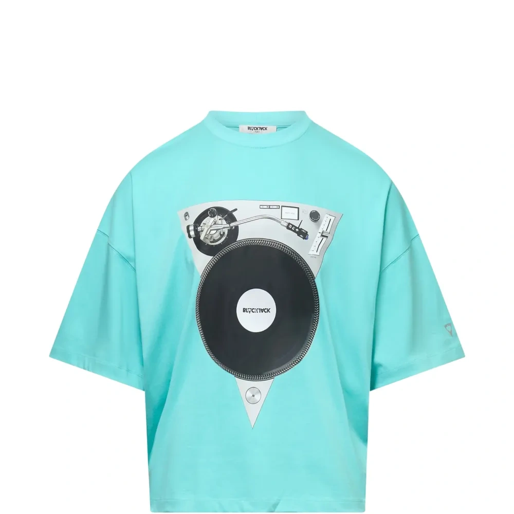 синяя футболка с графическим принтом, короткими рукавами, круглым вырезом, свободным кроем и нашивкой с логотипом