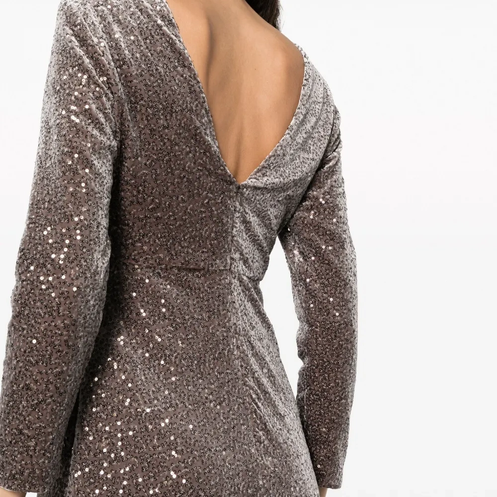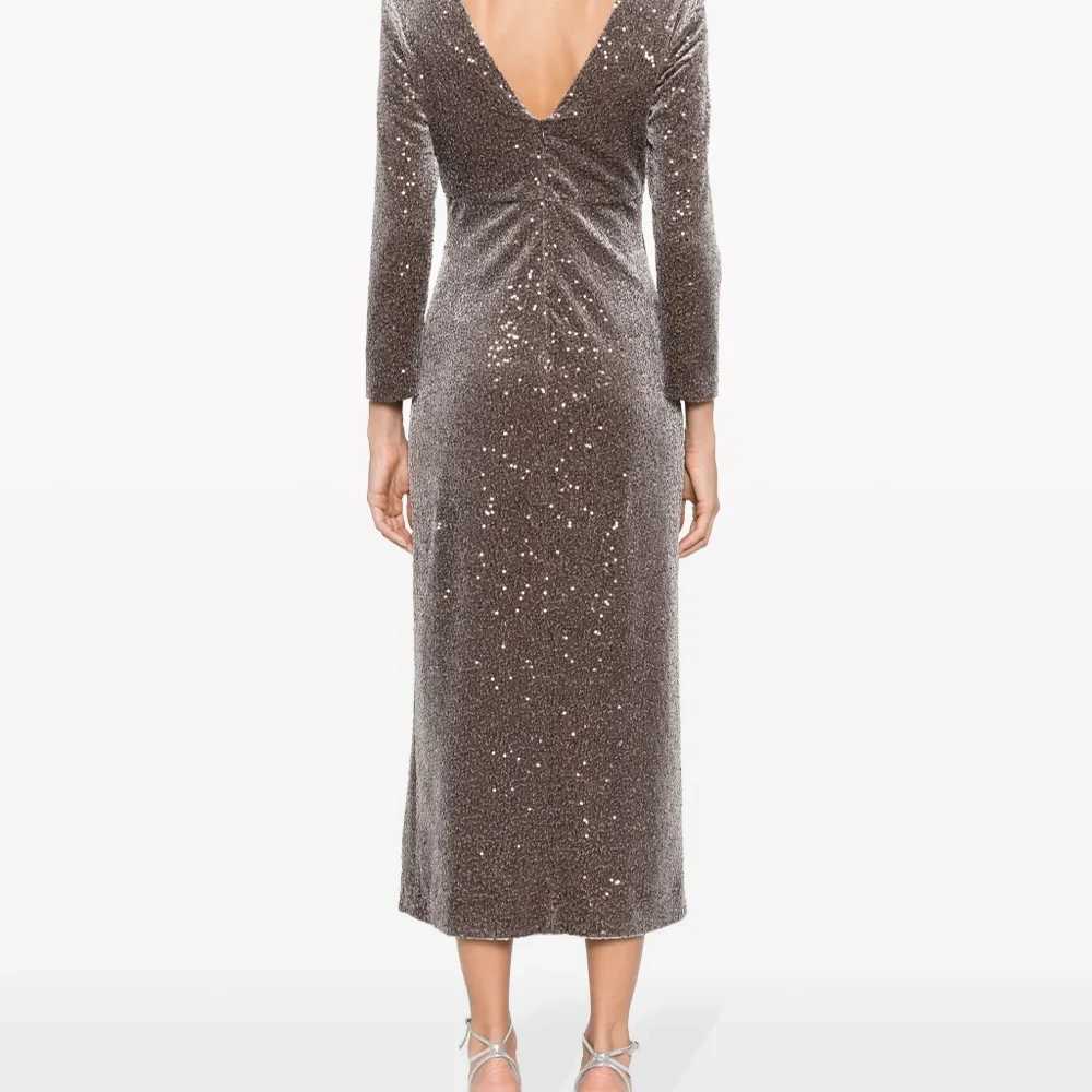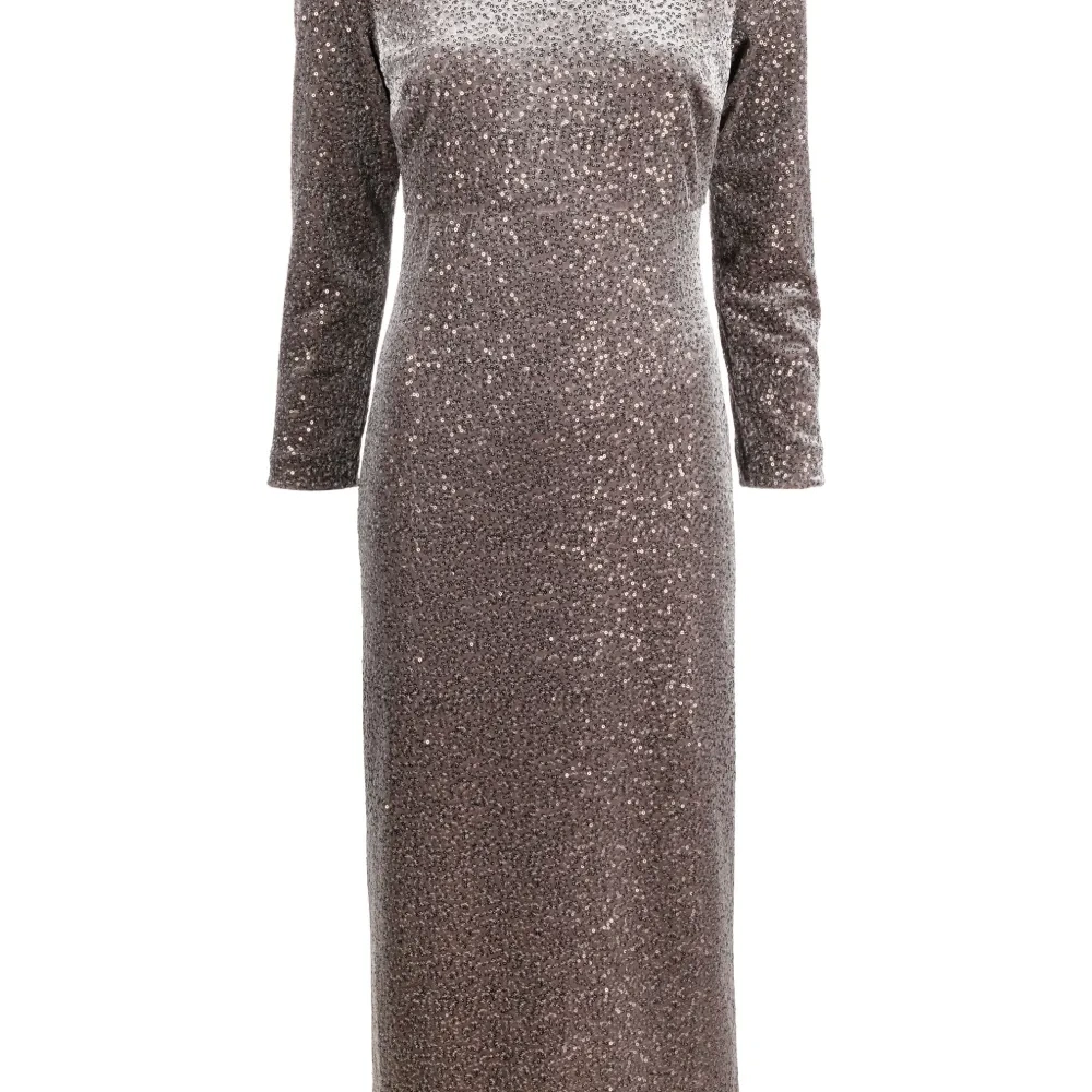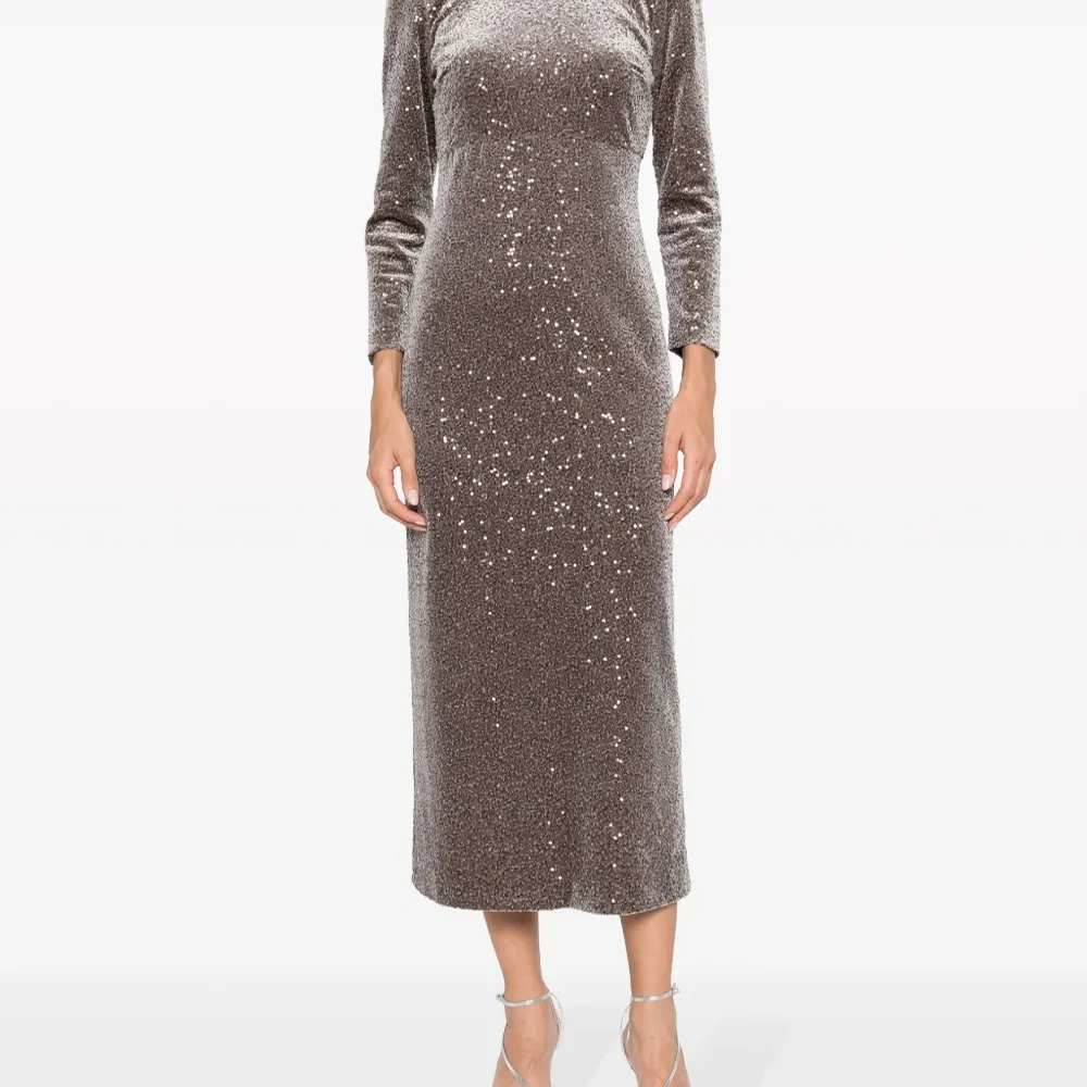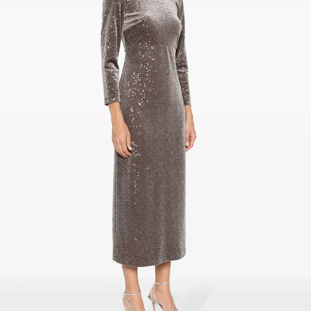 Коричневый, украшение из пайеток, бархатистое покрытие, круглый вырез, V-образный вырез сзади, длинные рукава, застежка на молнии сзади, длина до середины голени и прямой подол.