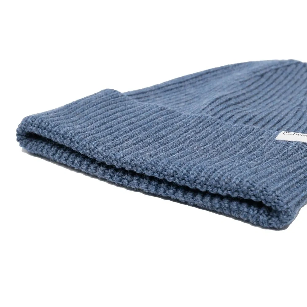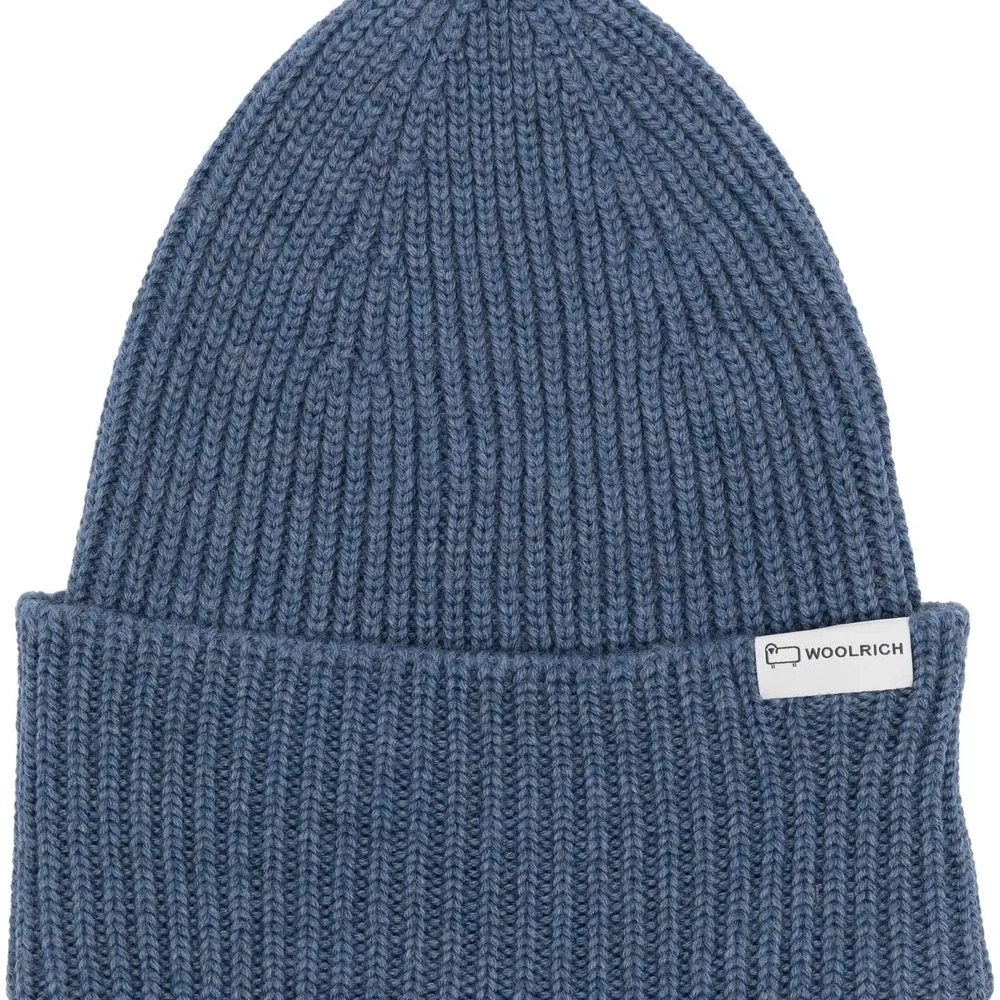 Синий, необработанная шерсть, трикотаж в рубчик, маленькая подвеска с логотипом и подвернутые поля.