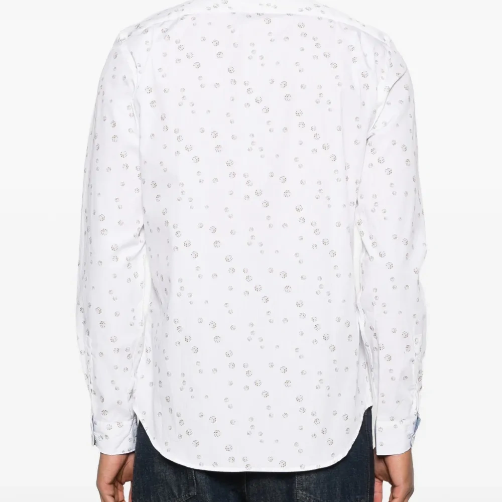 белая рубашка с длинными рукавами, принтом в виде игральных костей, застежкой на пуговицы и острым воротником