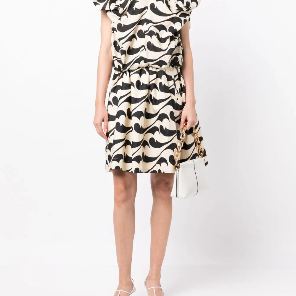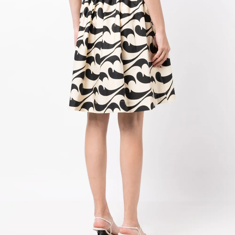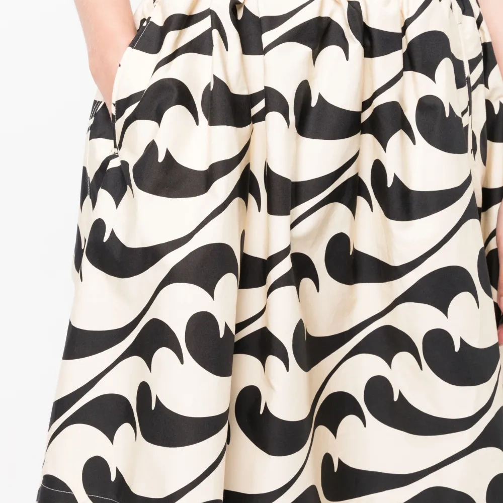 Экрю, черный, хлопок, абстрактный принт, средняя посадка, эластичный пояс, А-образный силуэт, прямой подол и длина выше колена.