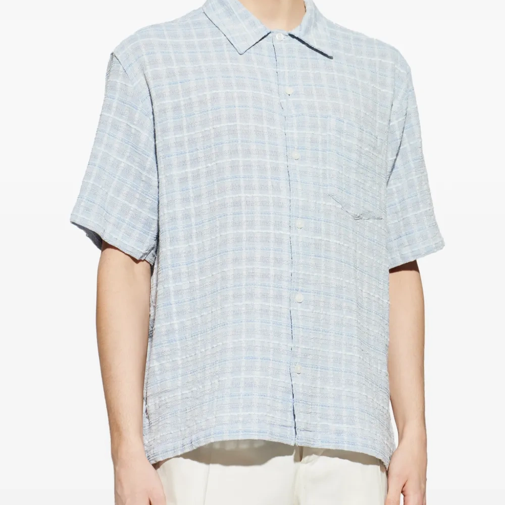 синие в клетку, с нагрудным карманом, застёжка на пуговицы, короткие рукава