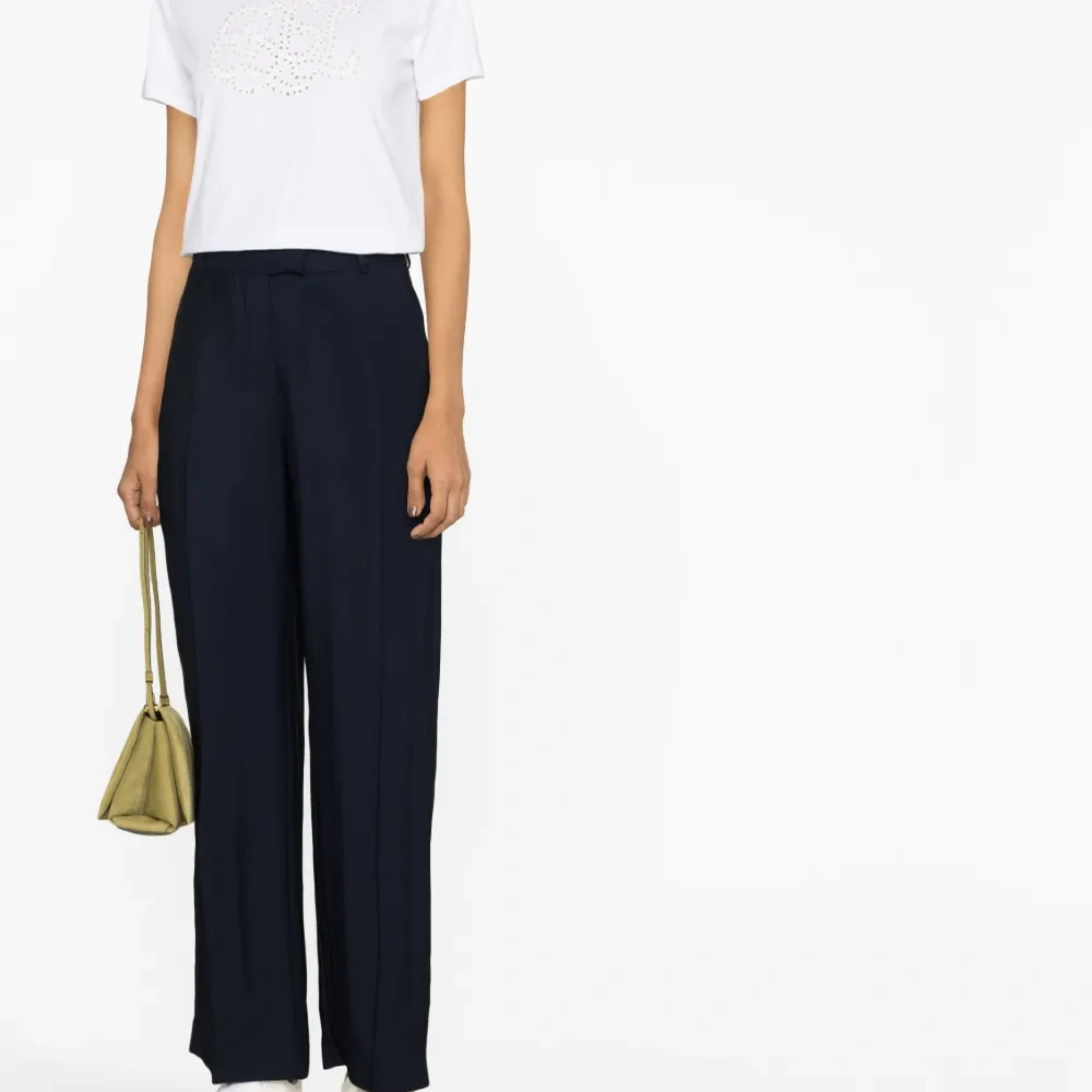 Белый, круглый вырез, короткие рукава и прямой подол.