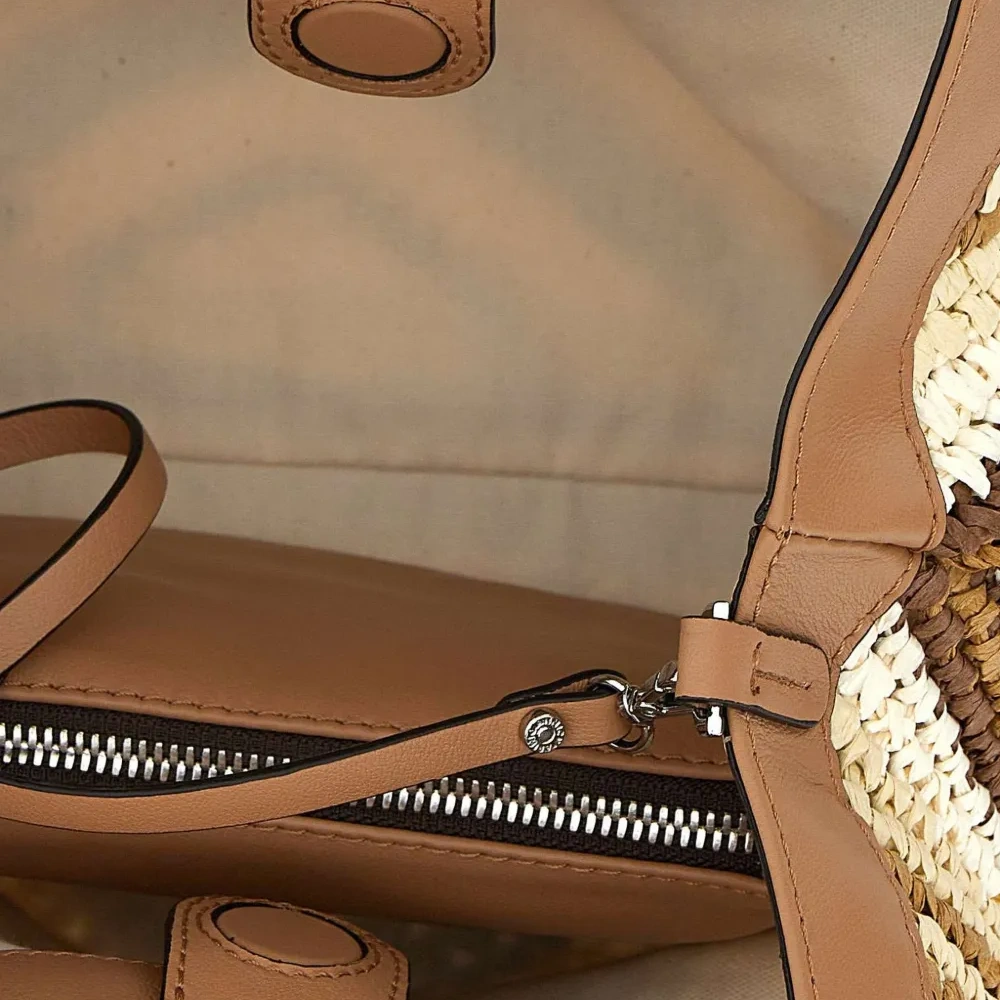 бежевые ручки из разноцветной плетёной соломы, съёмный ремешок, магнитная застёжка, внутренний мешочек