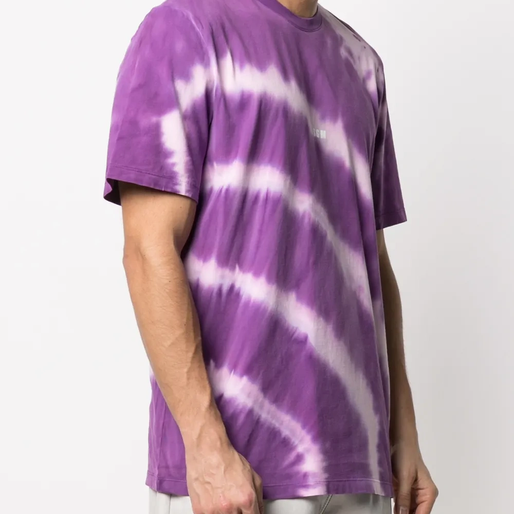 Принт тай-дай, принт с логотипом на груди, круглый вырез, короткие рукава и прямой подол. Цвет: фиолетовый.