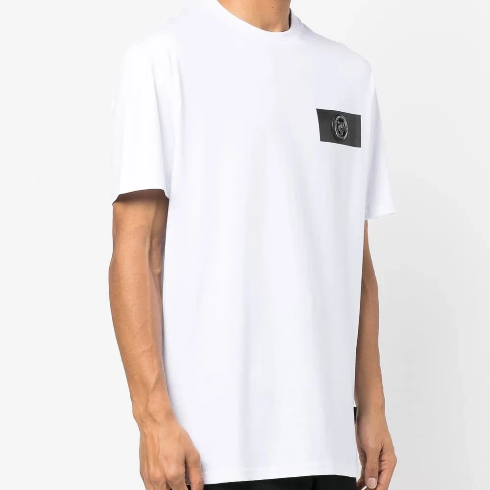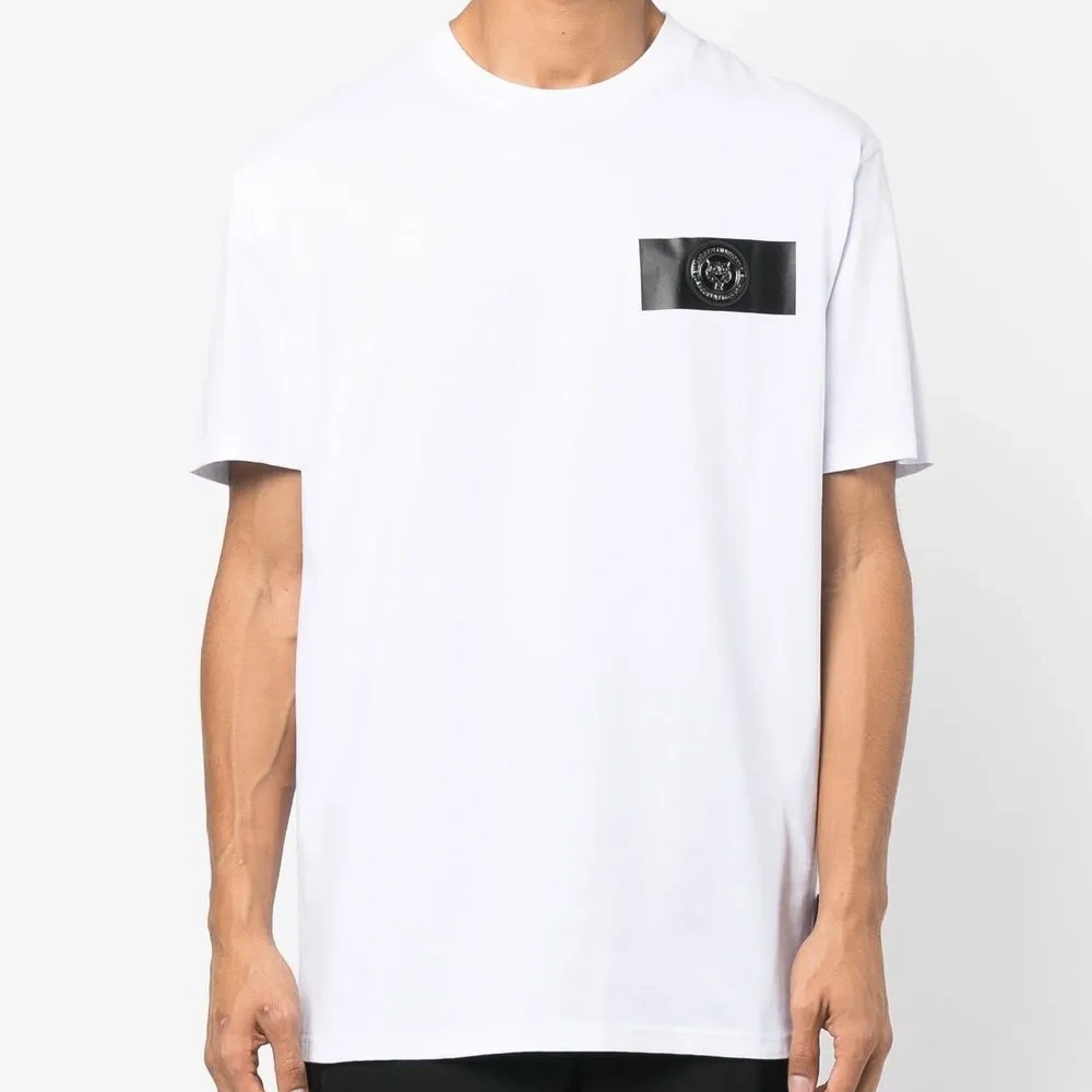 Белый/черный, нашивка с логотипом спереди, круглый вырез, короткие рукава и прямой подол.