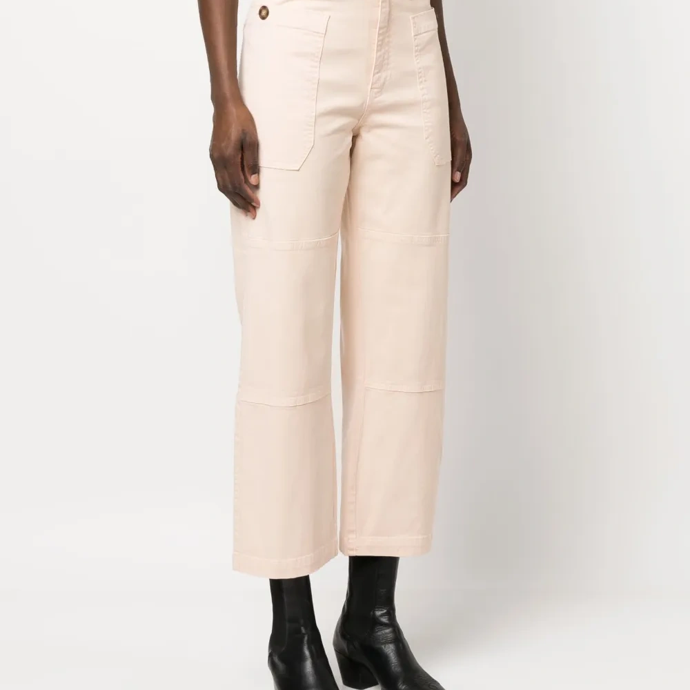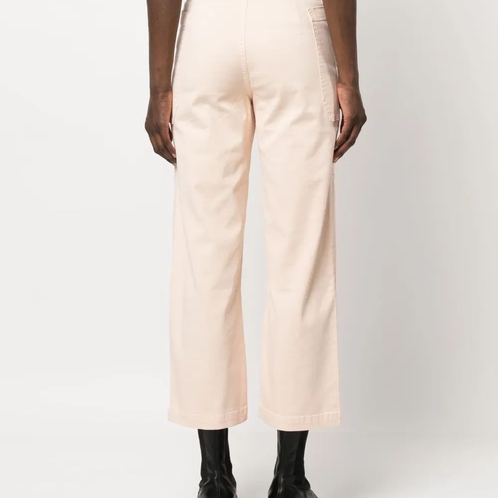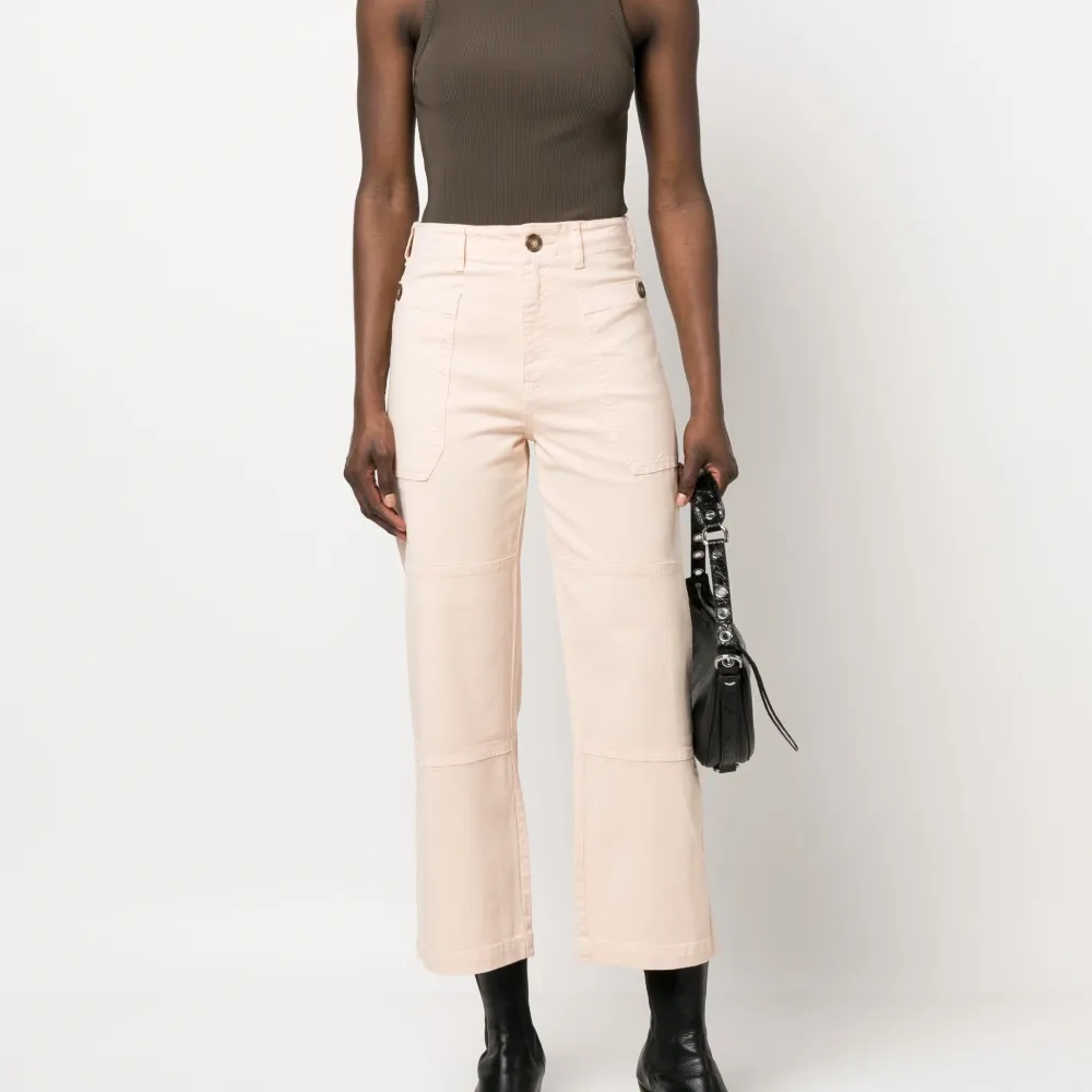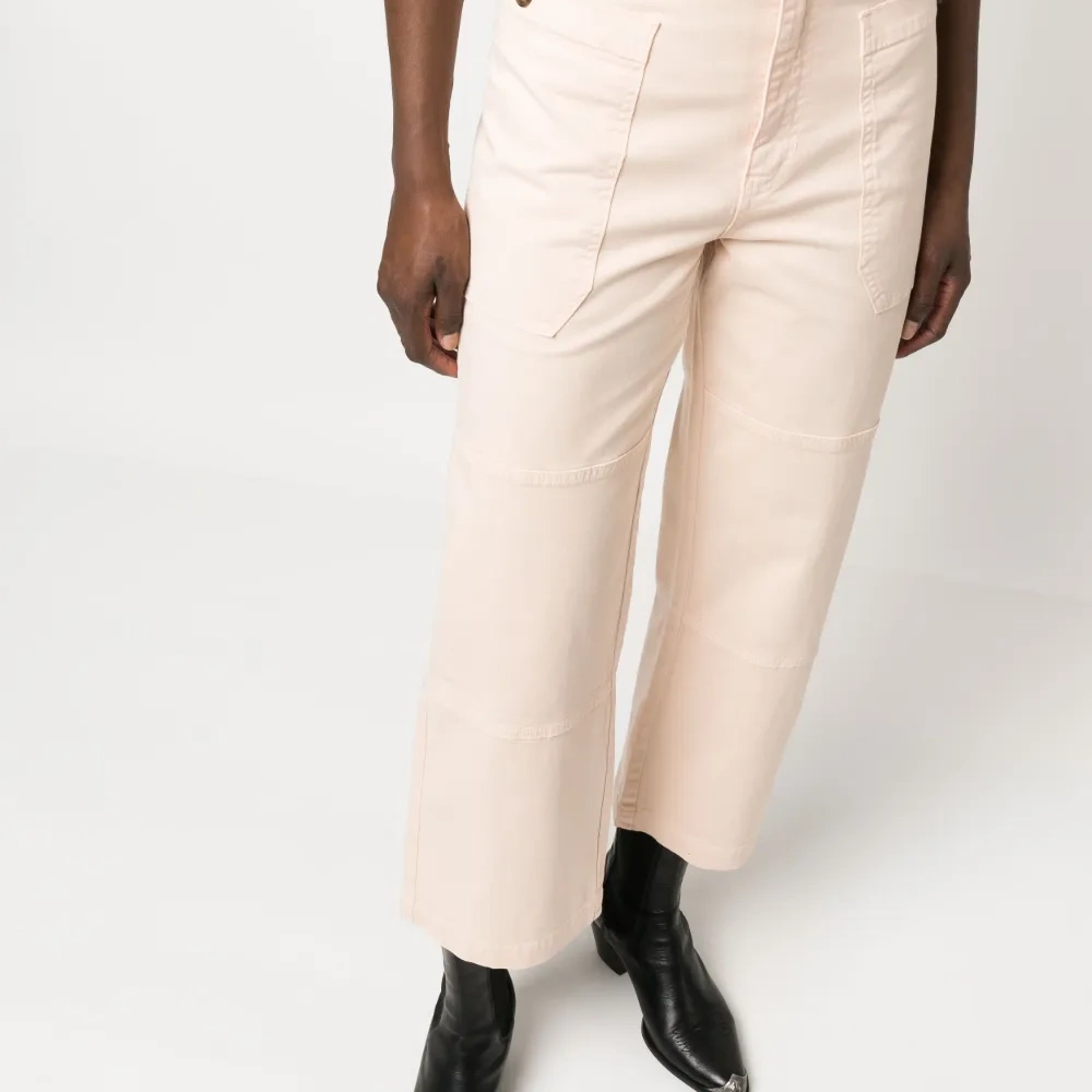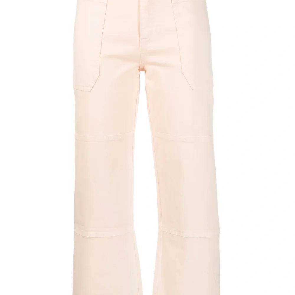 Светло-розовый, эластичный хлопок, завышенная талия, потайная застежка спереди, два накладных кармана по бокам и прямой крой.