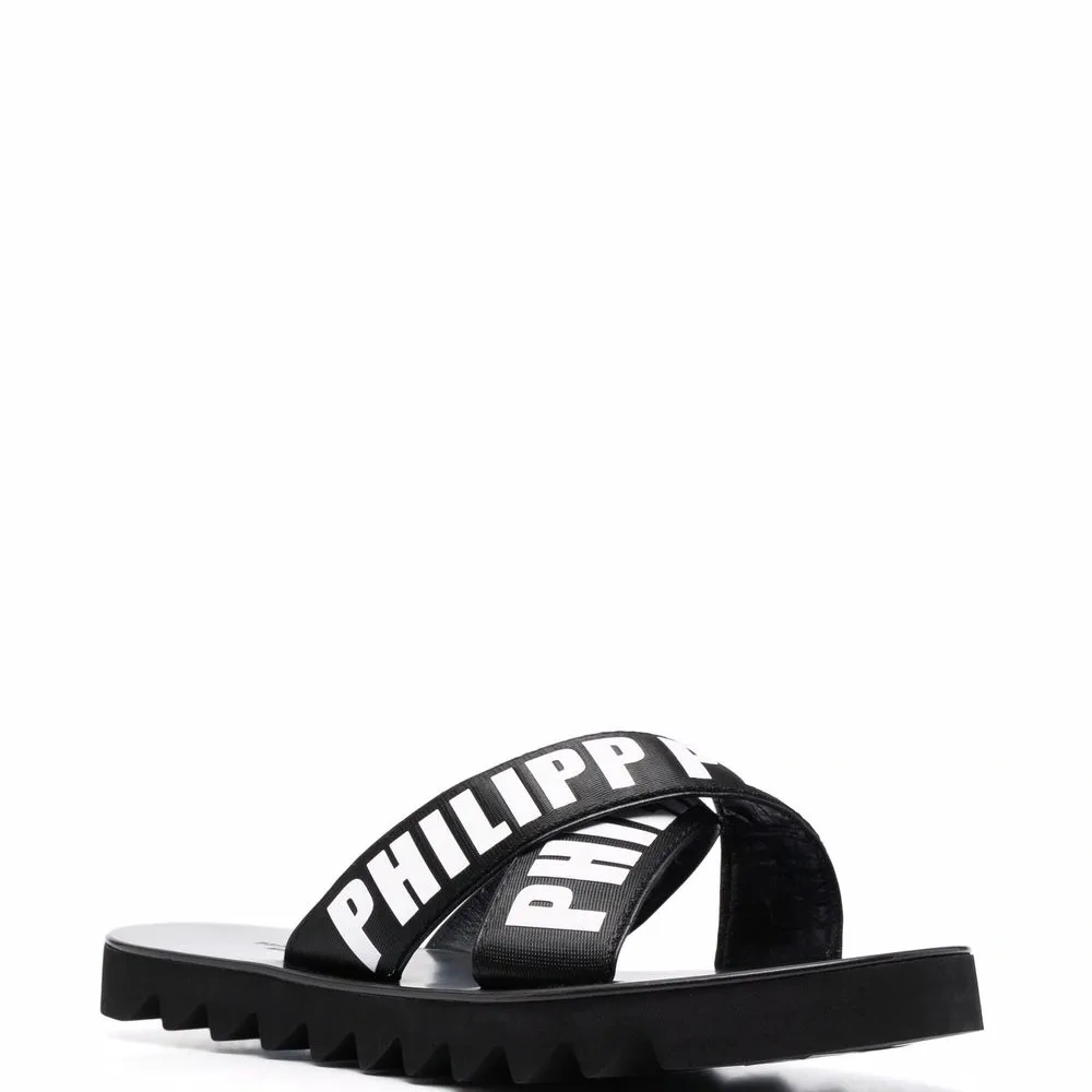Логотип спереди, открытый носок, перекрестные ремешки, стелька с логотипом и ребристая резиновая подошва. Цвет: черный.