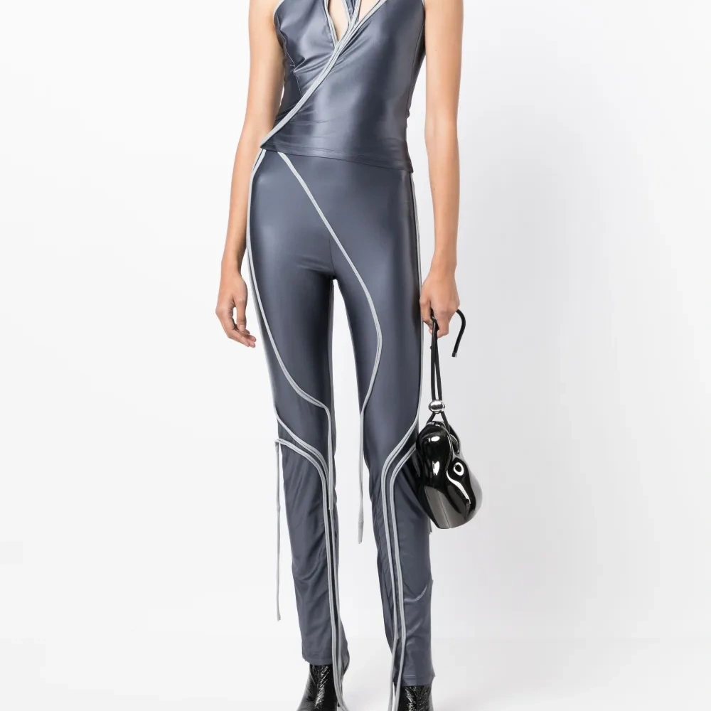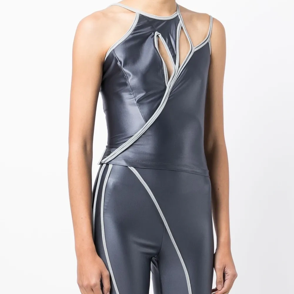 Сине-серый, эластичный материал, глянцевая фактура, вырез-петля халтер, вырезные детали, без рукавов и прямой подол.