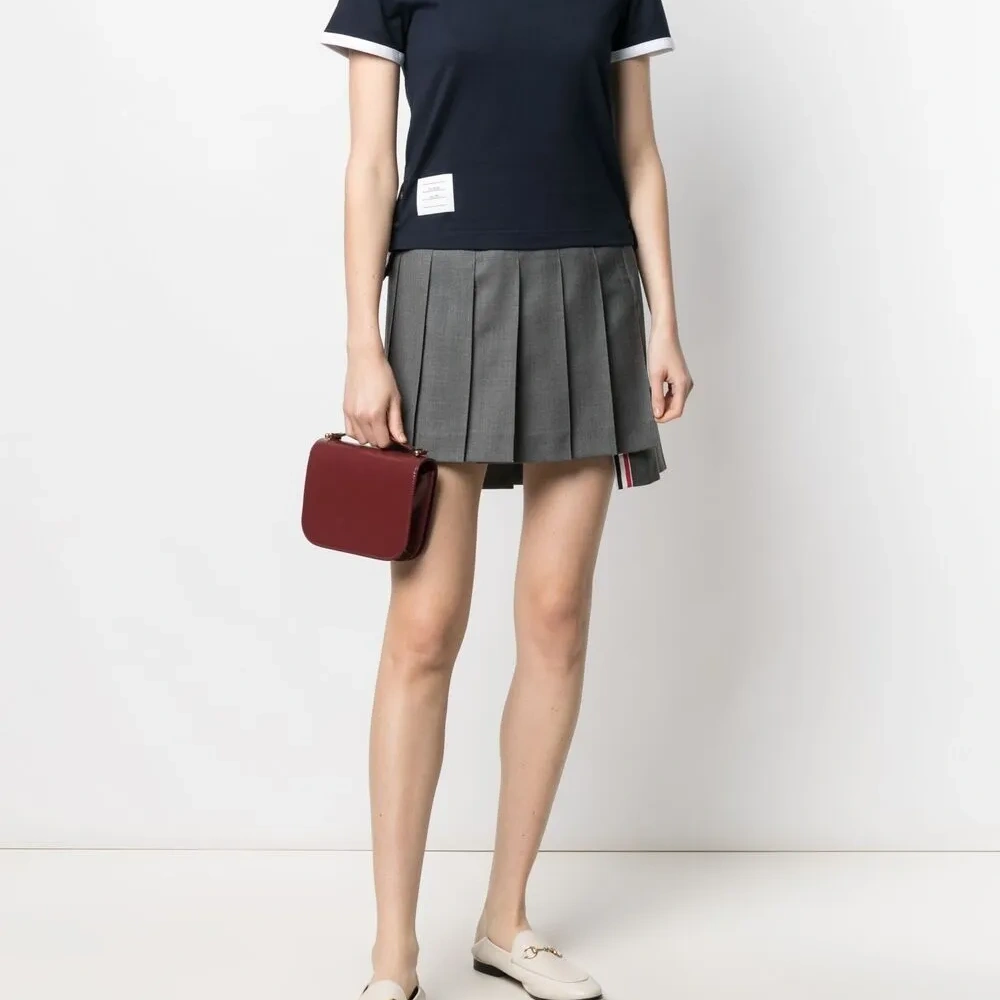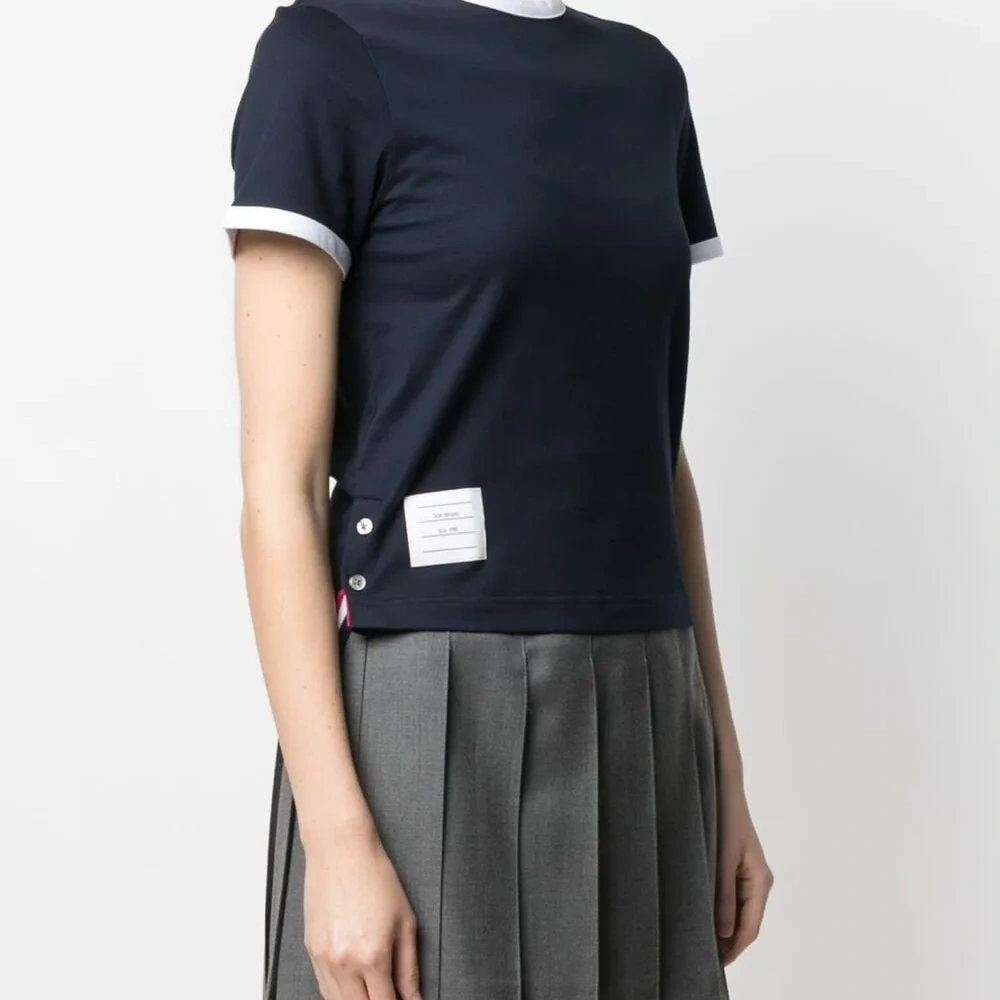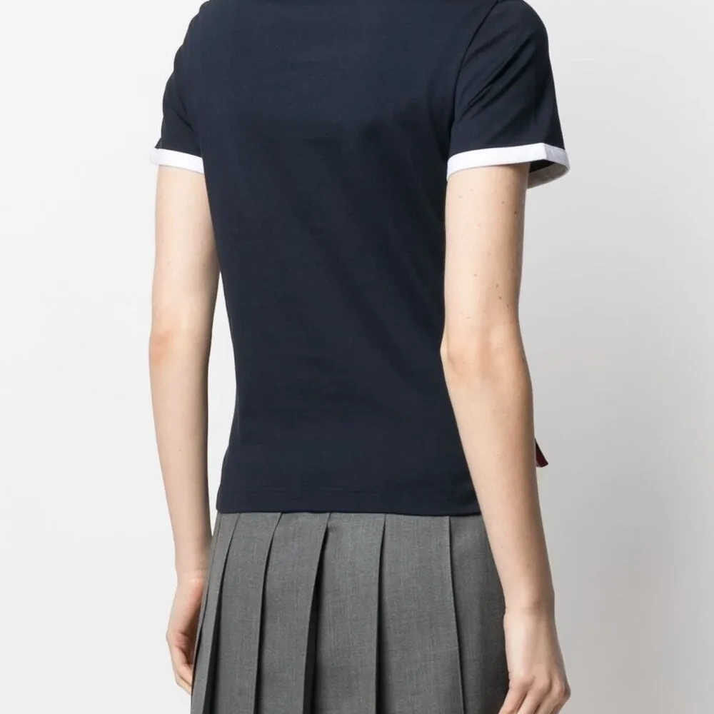 Короткие рукава, круглый вырез, контрастная отделка, ярлык с полосками 4-Bar, полоски RWB и асимметричный подол.