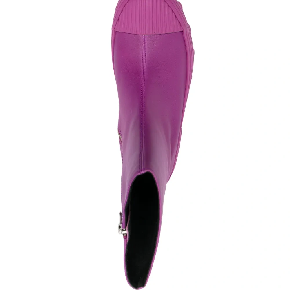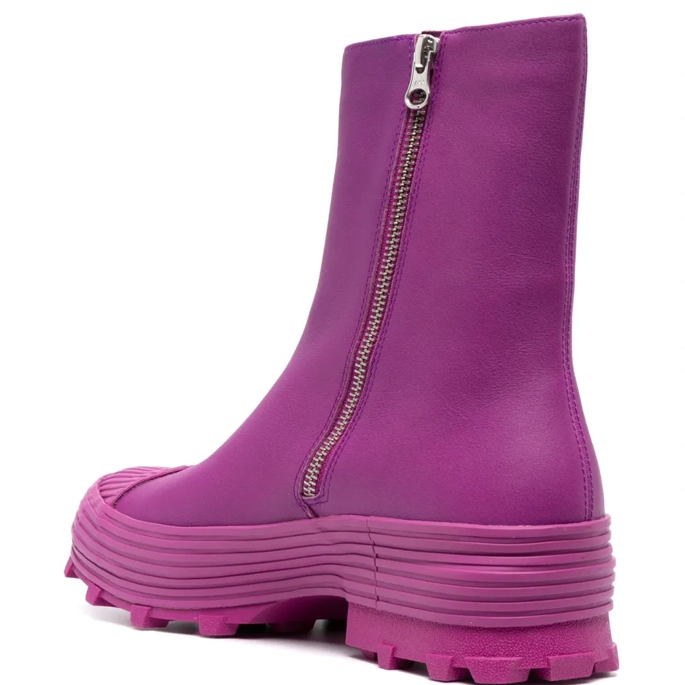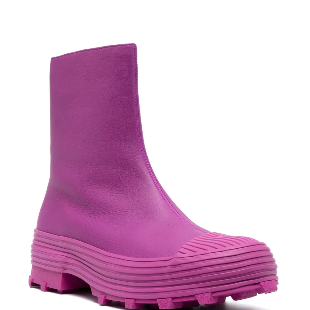 Фиолетовый, телячья кожа, гладкая текстура кожи, строчка в тон, носок в тон, закругленный носок, застежки на молнии сбоку, длина до середины голени, массивная резиновая подошва и низкий блочный каблук. Кожа в составе этого товара сделана на фабрике, сертифицированной организациями Leather Working Group (LWG) или ICEC. Это гарантирует, что производитель минимизировал негативное влияние материала на окружающую среду. Узнать больше о том, какие товары получают отметку «Ответственный выбор», можно из материала «Как мы оцениваем экологичность и этичность».