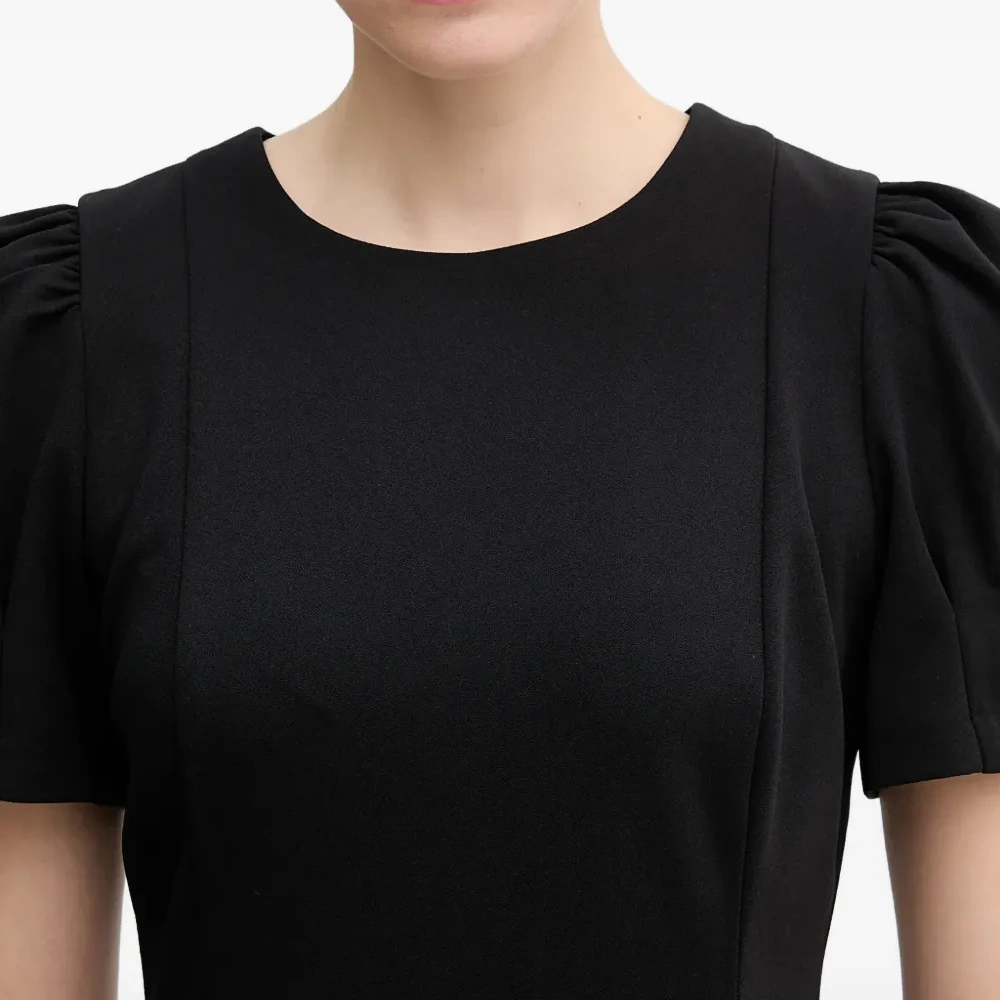 черный цвет, короткие рукава, круглый вырез, застежка-молния сзади, облегающий силуэт, длина до колена