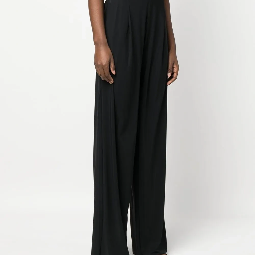 Черный, эластичный материал, завышенная талия, широкий крой, длинная модель, стрелки и два прорезных кармана по бокам.