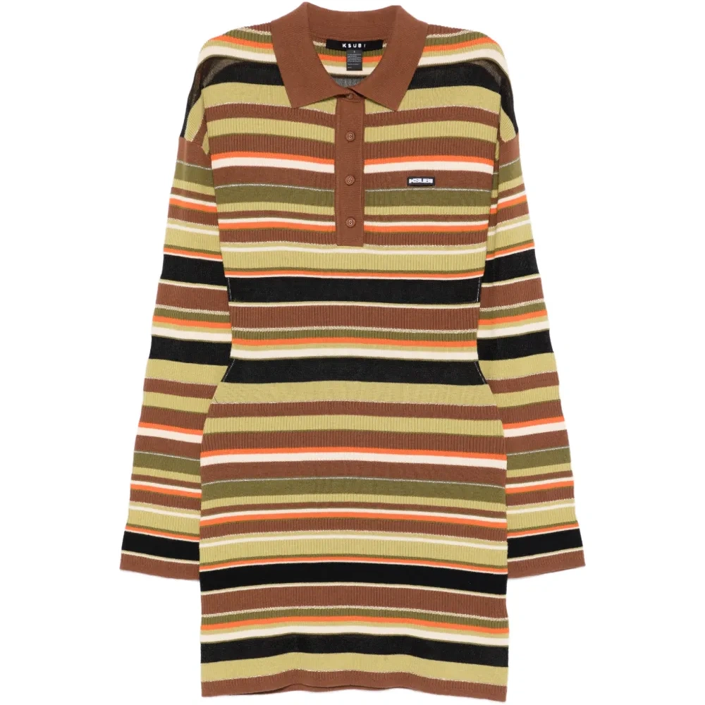 коричневая и разноцветная полосатая рубашка-поло с длинными рукавами, застёжкой на пуговицы и отложным воротником