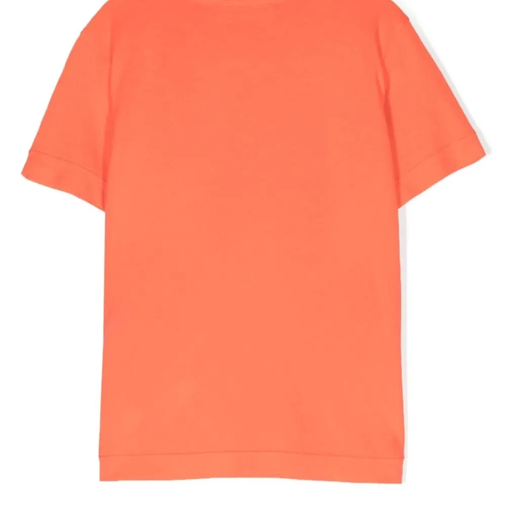 Мандариново-оранжевый, хлопок, ткань джерси, нашивка с логотипом на груди, круглый вырез, короткие рукава и прямой подол.