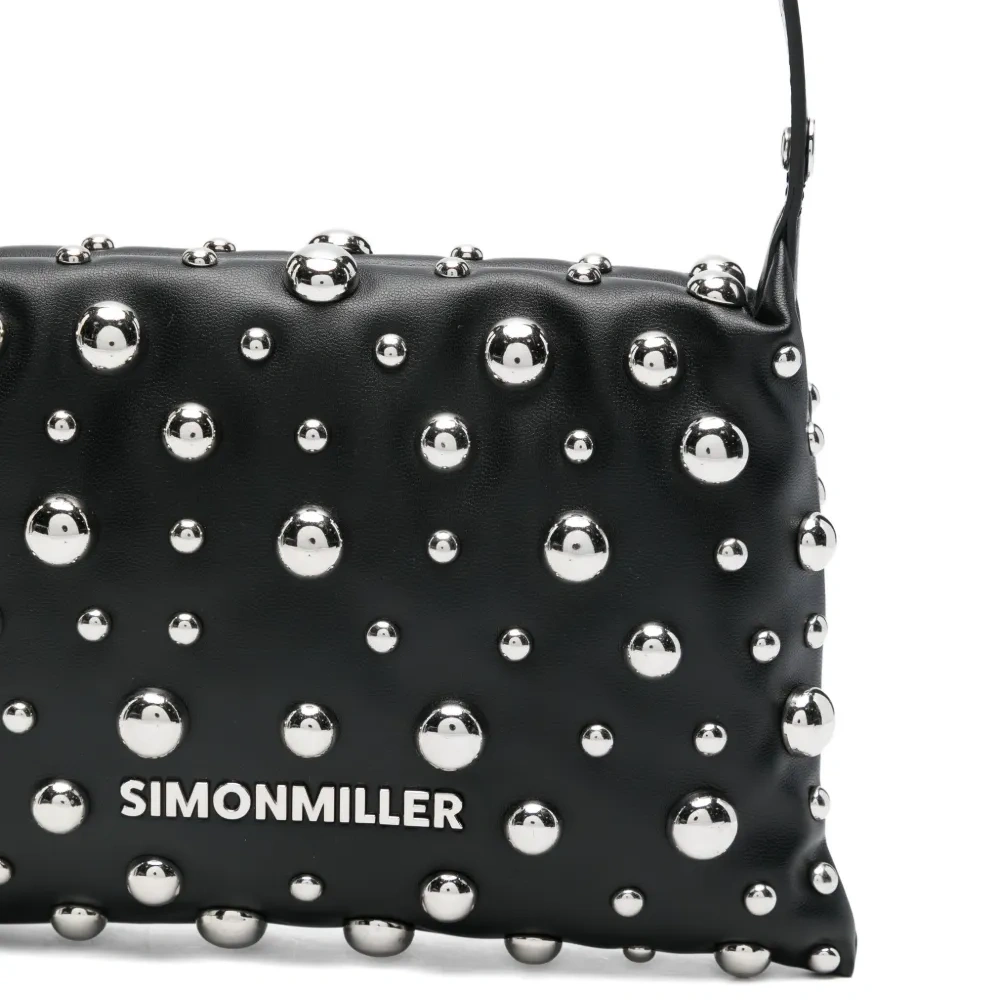 черный кожаный ремень на одно плечо с металлическими заклепками, прямоугольная форма, фирменная надпись с логотипом