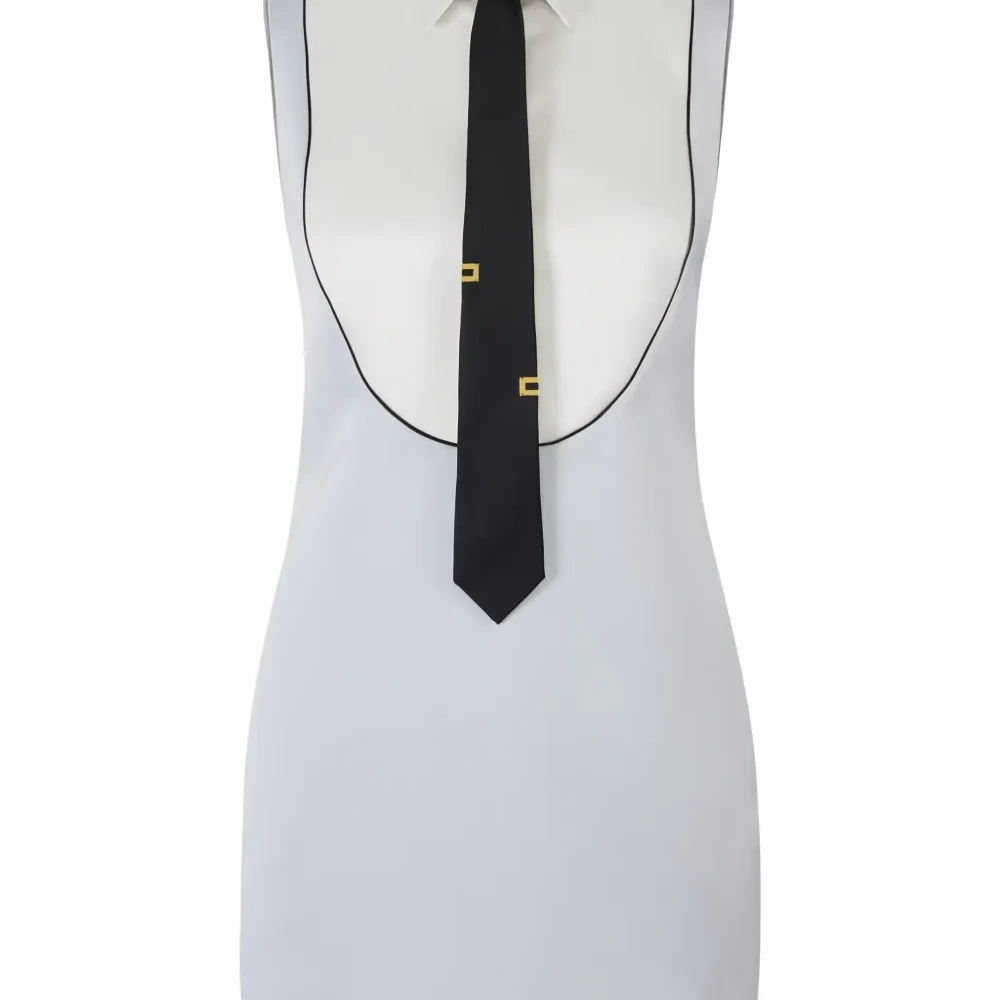 сорочка без рукавов цвета звёздного света и слоновой кости с воротником-стойкой, отделкой в виде завязки, кантами и логотипом
