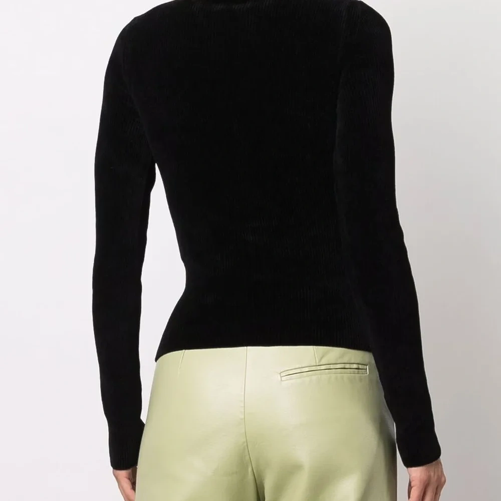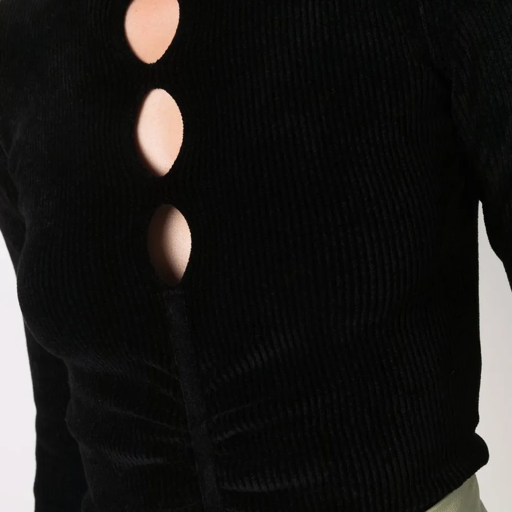 Черный, трикотаж в рубчик, вырезные детали, высокий воротник, длинные рукава и прямой подол.