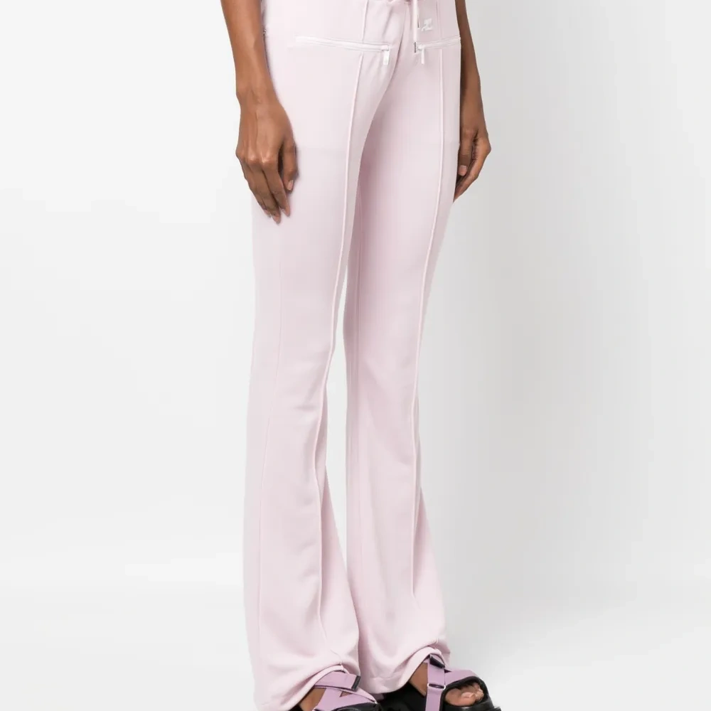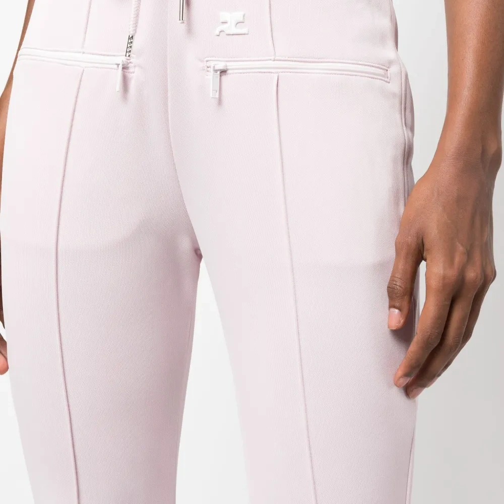 Пудрово-розовый, эластичный материал, нашивка с логотипом спереди, передние карманы на молнии, кулиска, эластичный пояс и расклешенный крой.