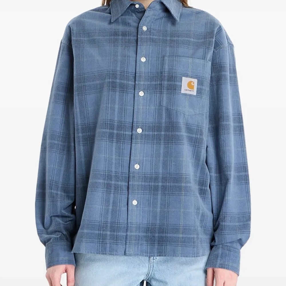 синяя рубашка в клетку с нагрудным карманом, застёжкой на пуговицы, длинными рукавами и отложным воротником