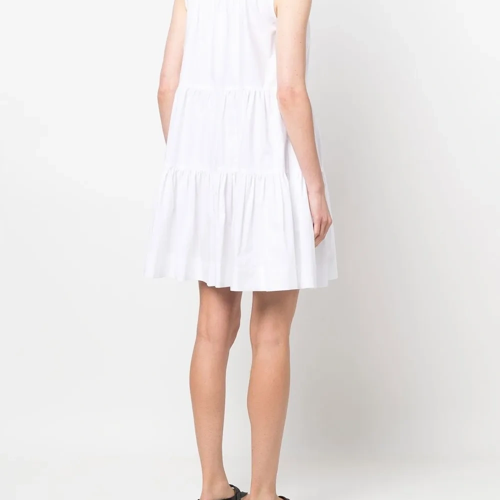 Белый, хлопок, воротник-стойка, застежка на пуговицах спереди, прорезные карманы по бокам, без рукавов, ярусная юбка, расклешенный крой и прямой подол.