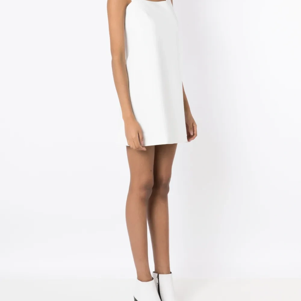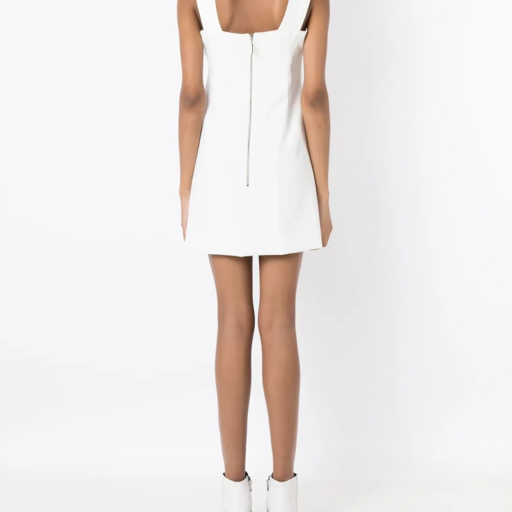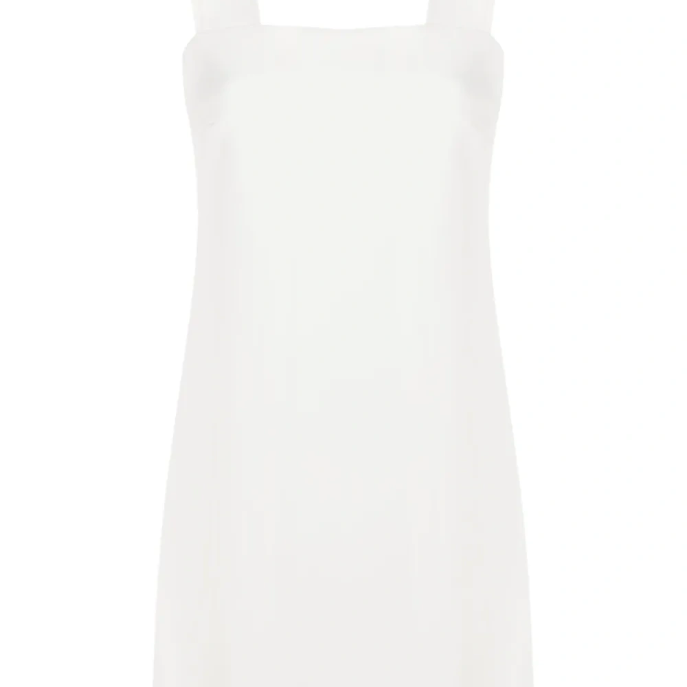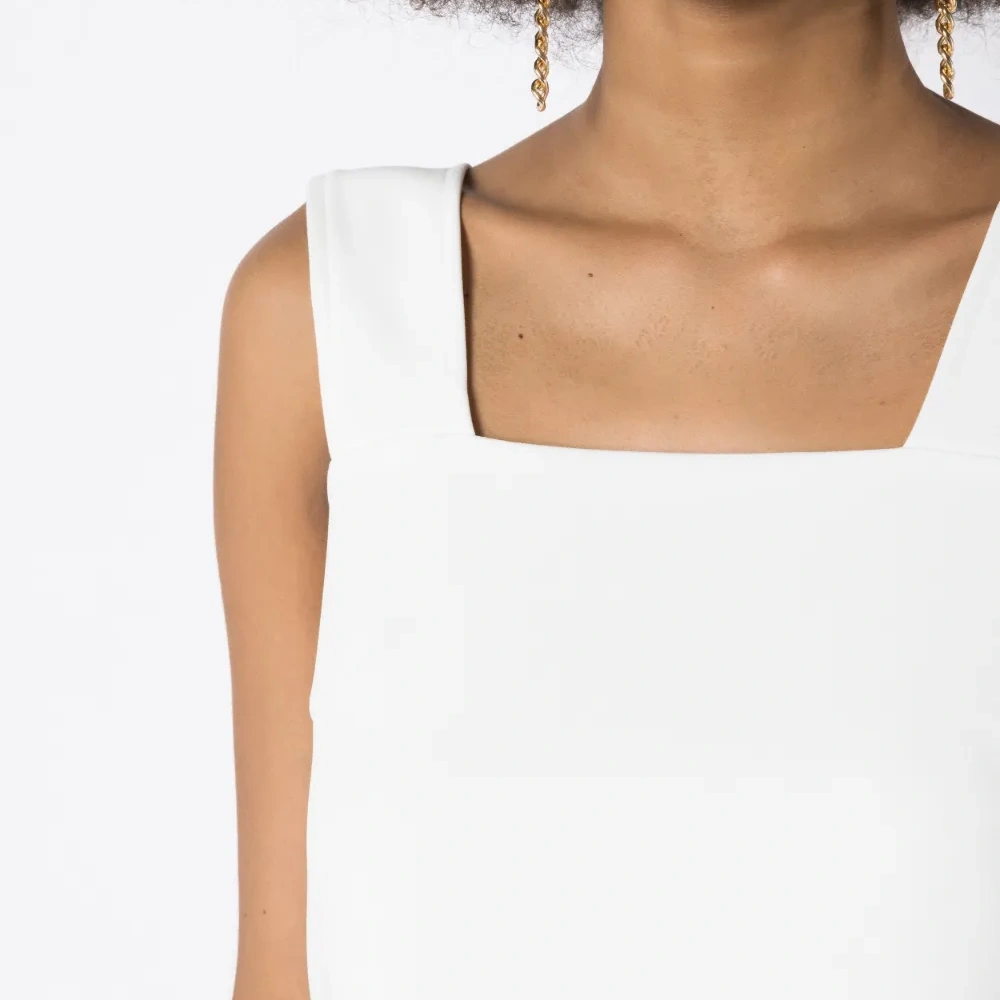 Кремовый, квадратный вырез, застежка на молнии сзади, широкие бретели, без рукавов, прямой подол и длина до бедер.