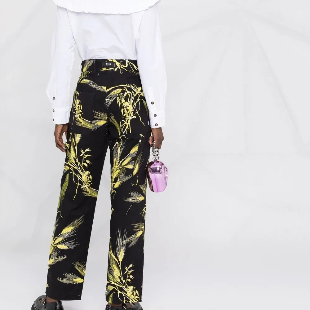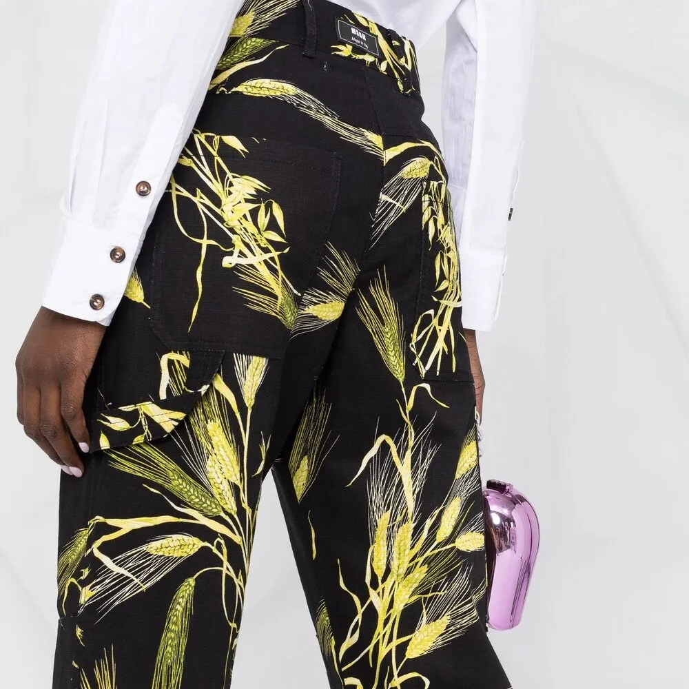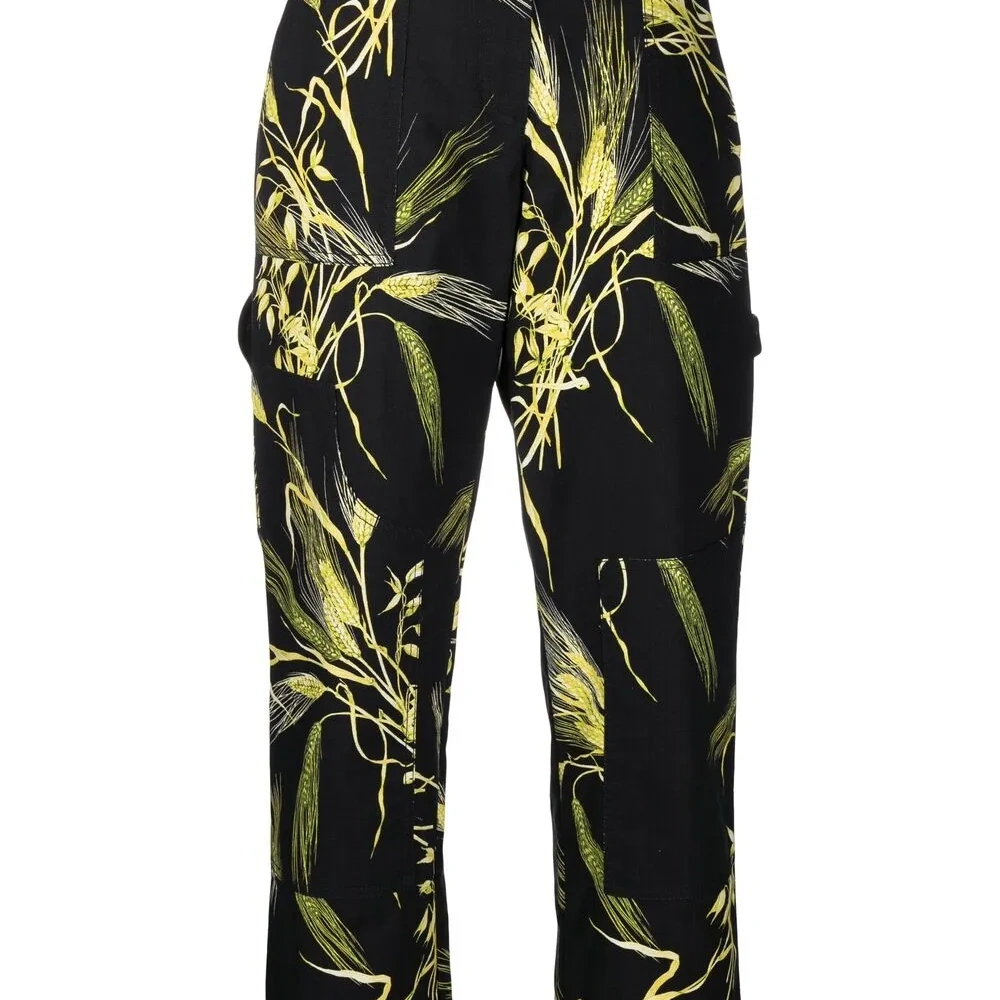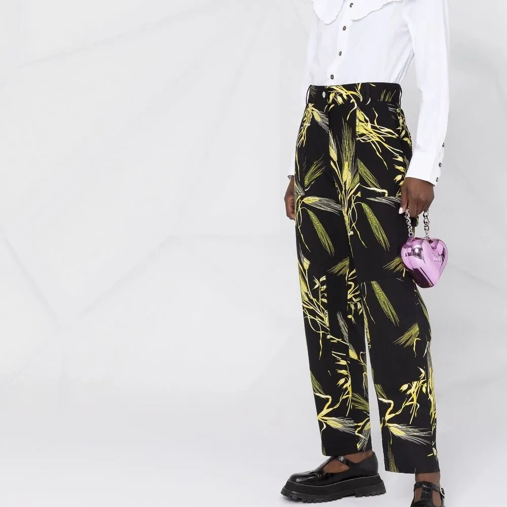 Принт с изображением листьев, петли для ремня, застежка на молнии и пуговице спереди, два кармана с клапанами по бокам и прямой крой.