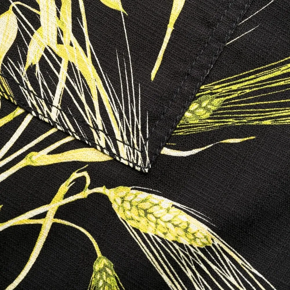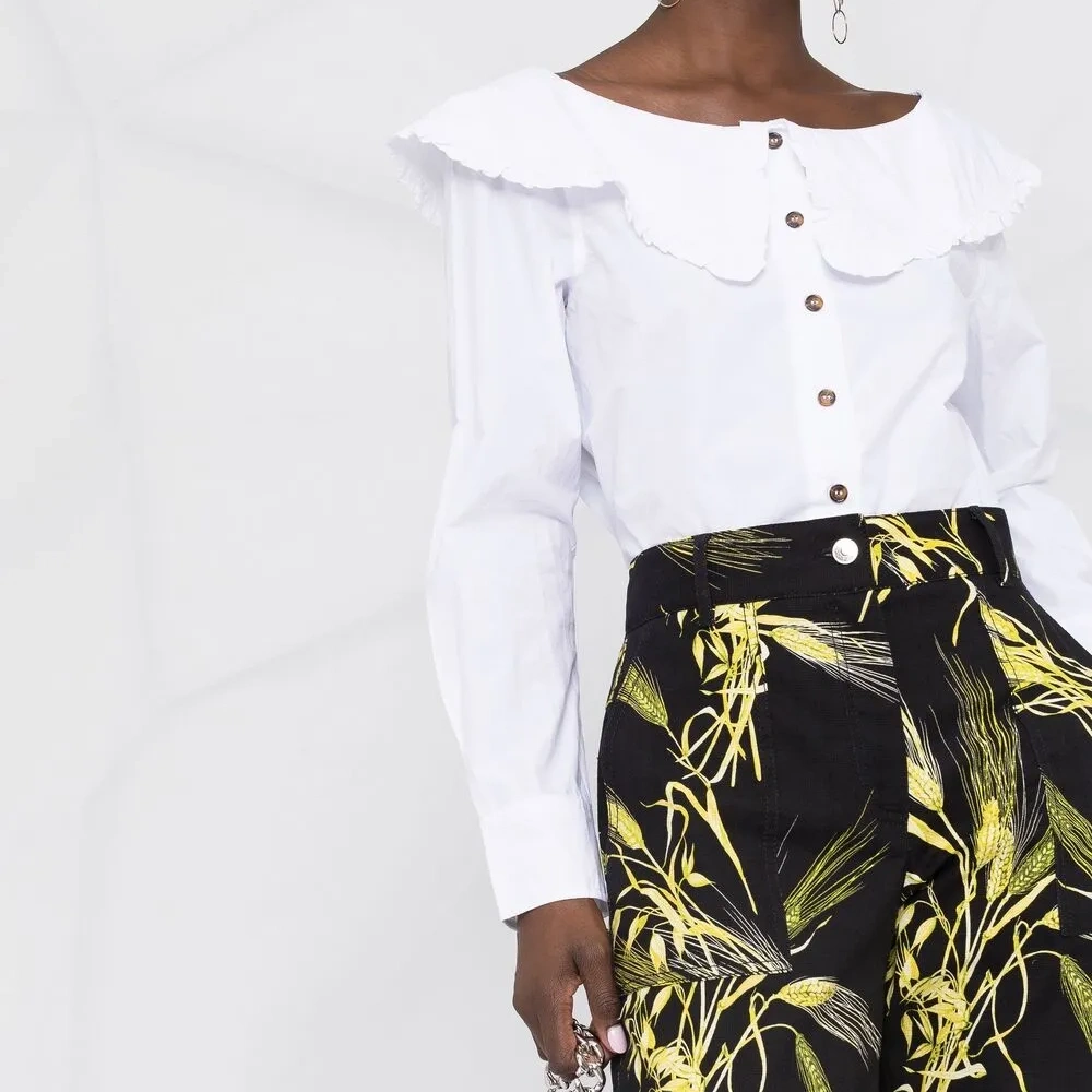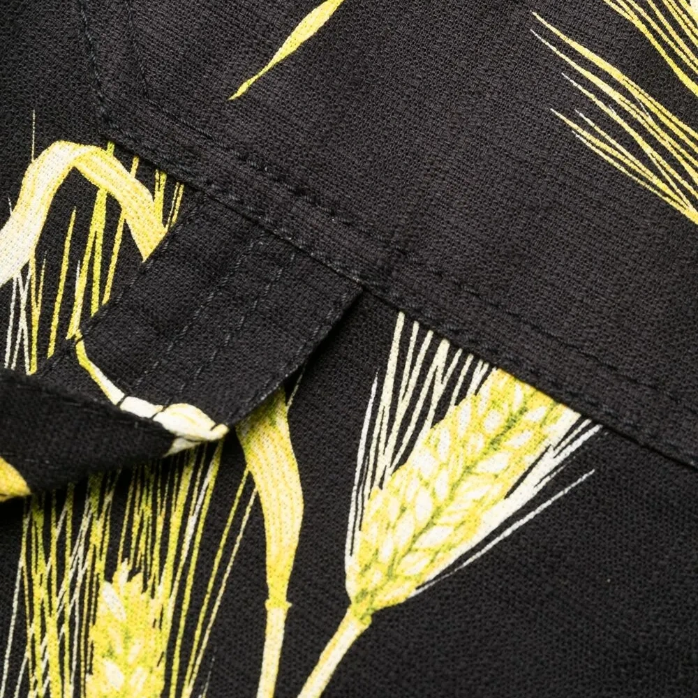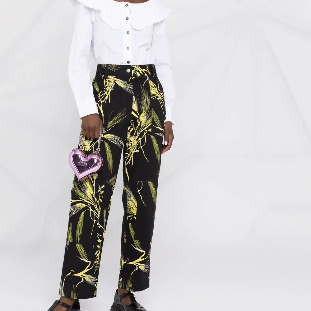 Принт с изображением листьев, петли для ремня, застежка на молнии и пуговице спереди, два кармана с клапанами по бокам и прямой крой.