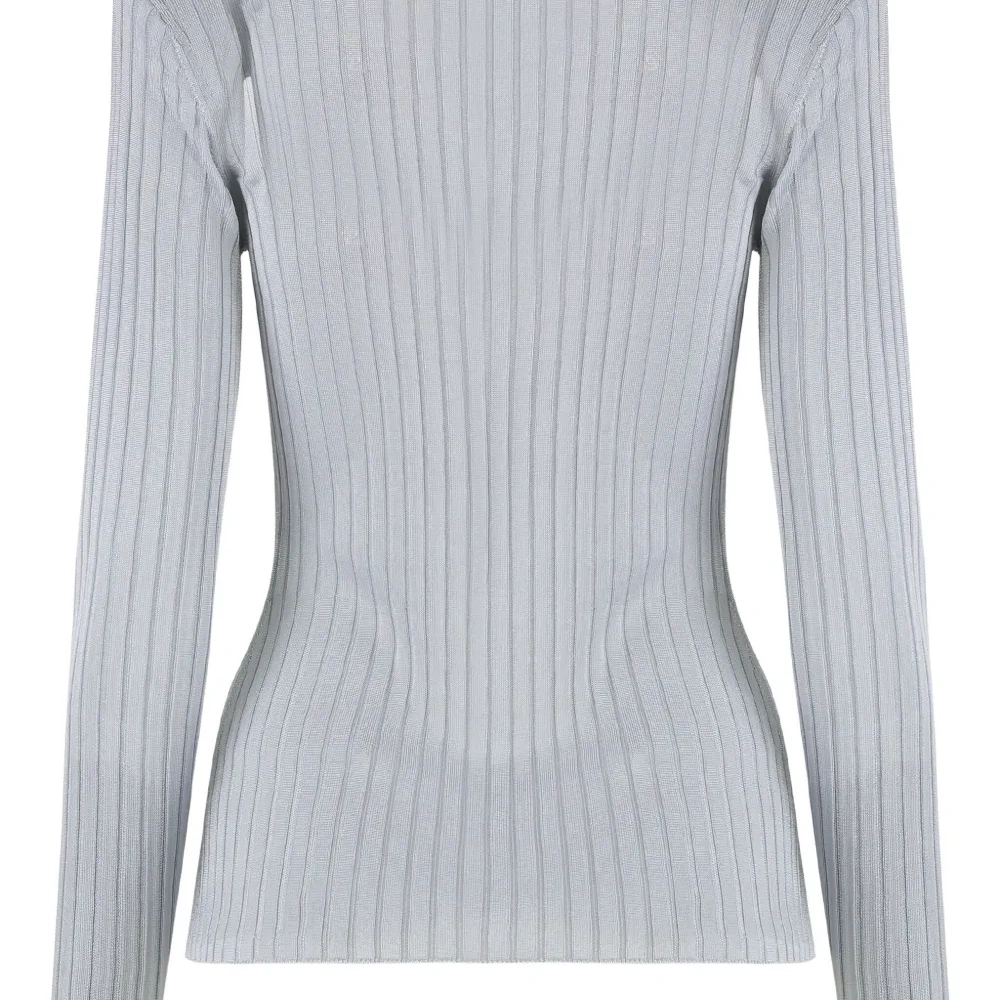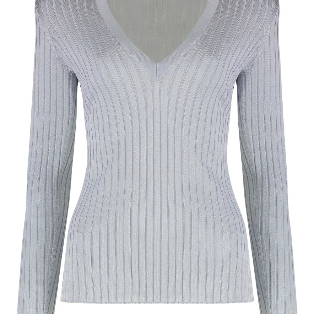 светло-серый в рубчик, с V-образным вырезом, длинными рукавами и подплечниками