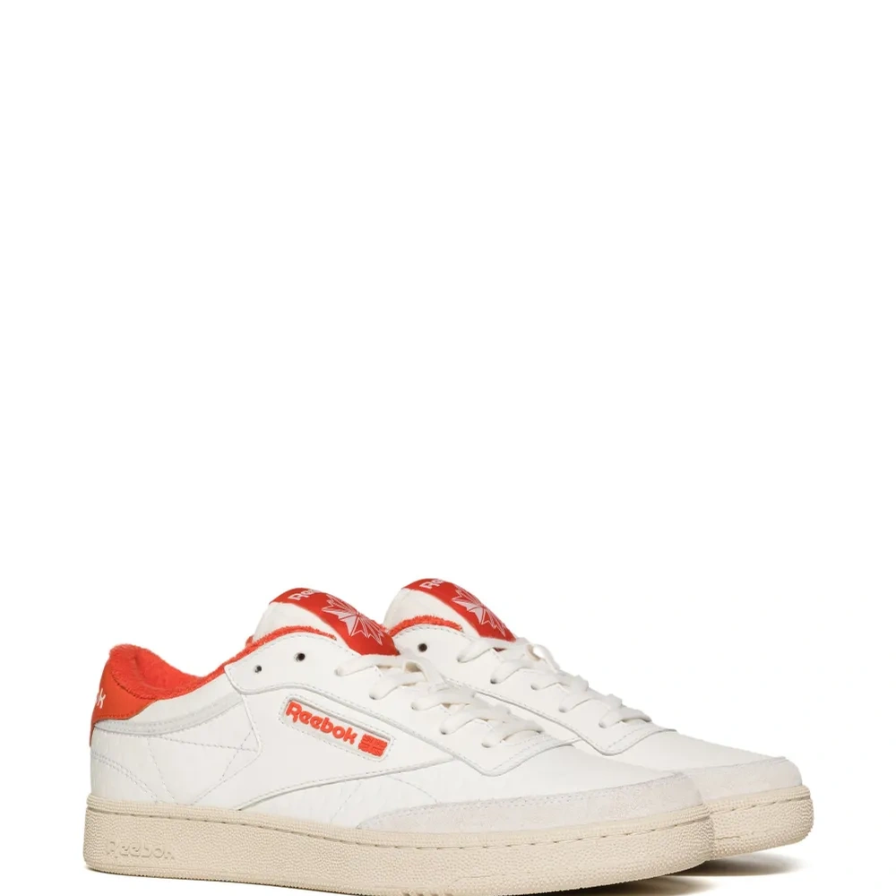Белый, оранжевый, телячья кожа, замшевые вставки, отделка с тиснением, нашивка с логотипом сбоку, задник с логотипом, нашивка с логотипом на язычке, шнуровка спереди, закругленный носок, логотип на подошве и плоская резиновая подошва.