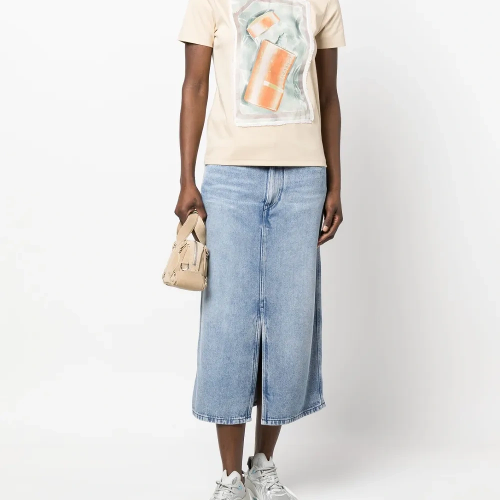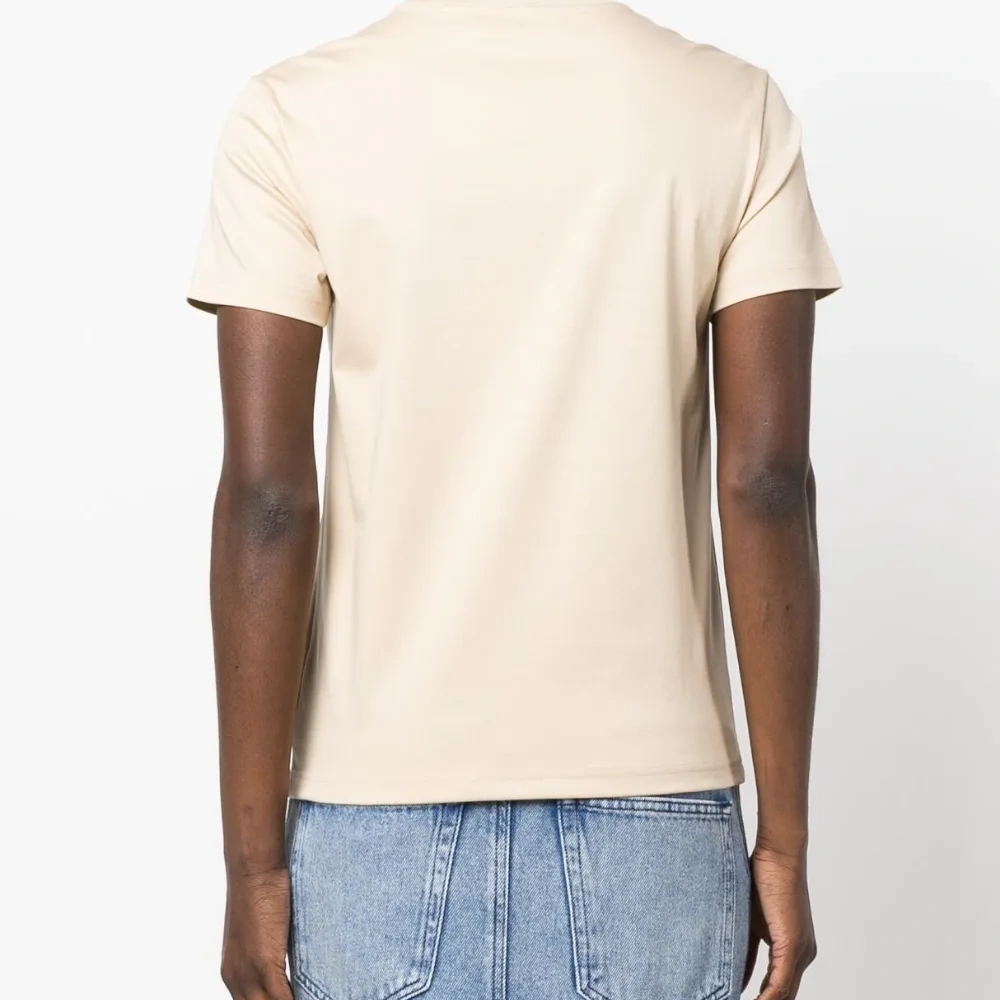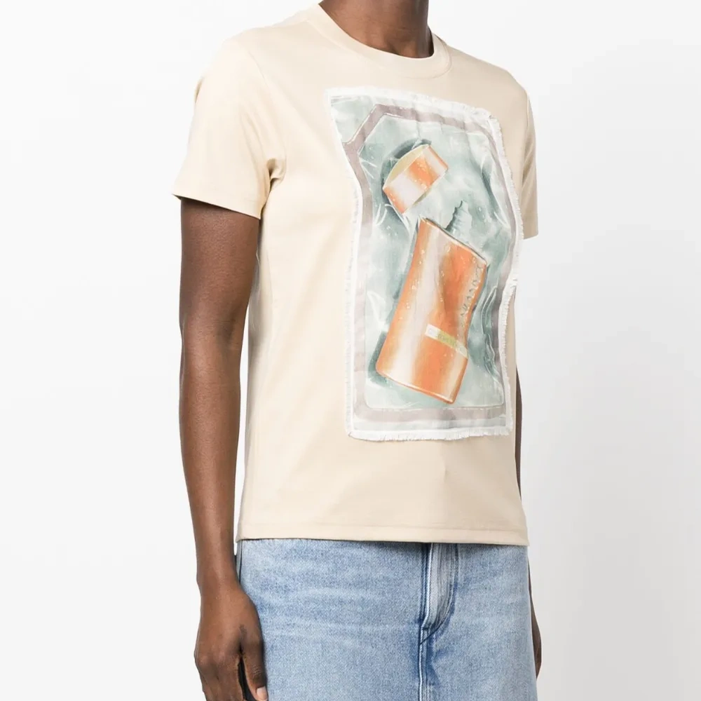 Бежевый, разноцветный, хлопок, лен, графичный принт спереди, круглый вырез, короткие рукава и прямой подол.