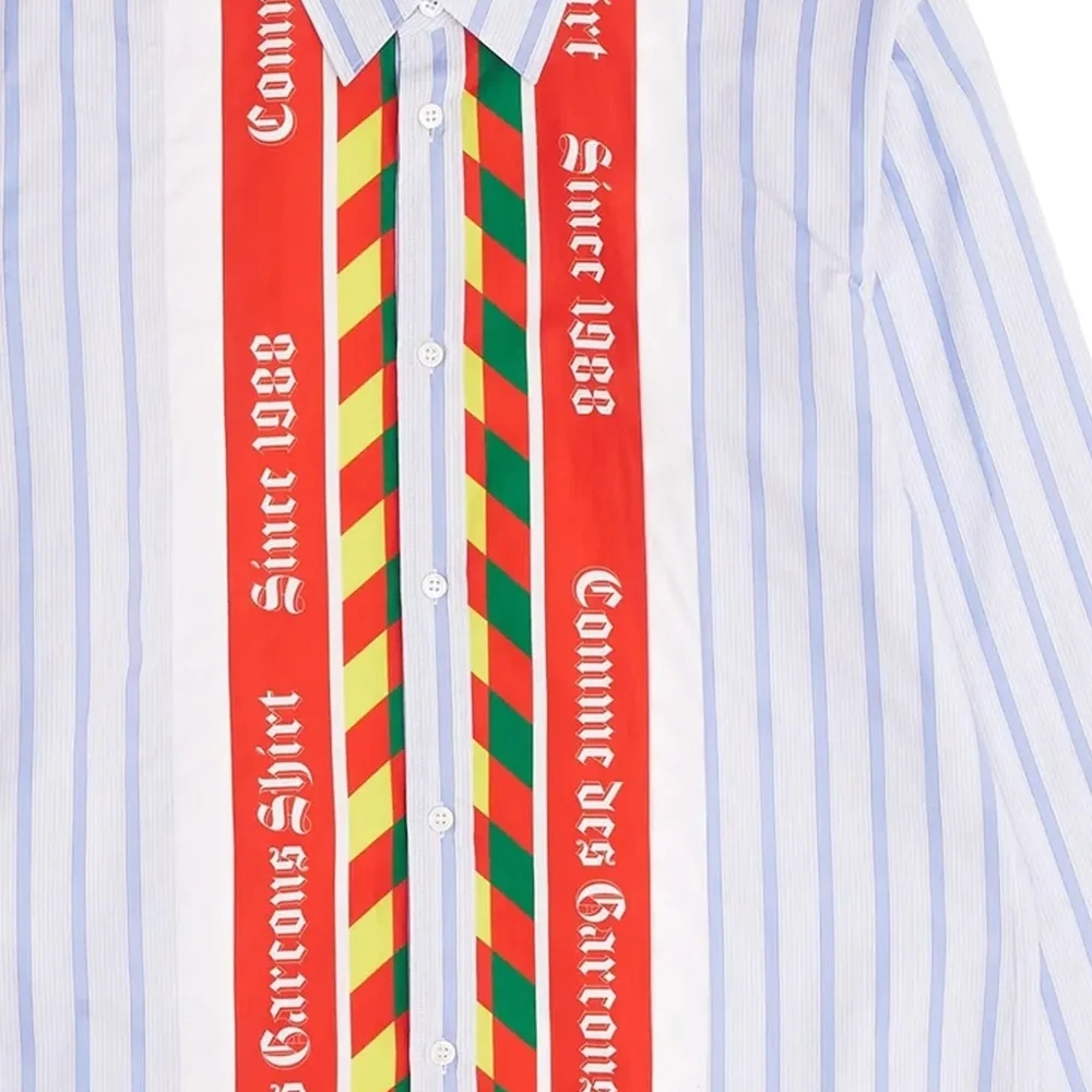 белая рубашка с полосками, логотипом, застёжкой на пуговицы и длинными рукавами