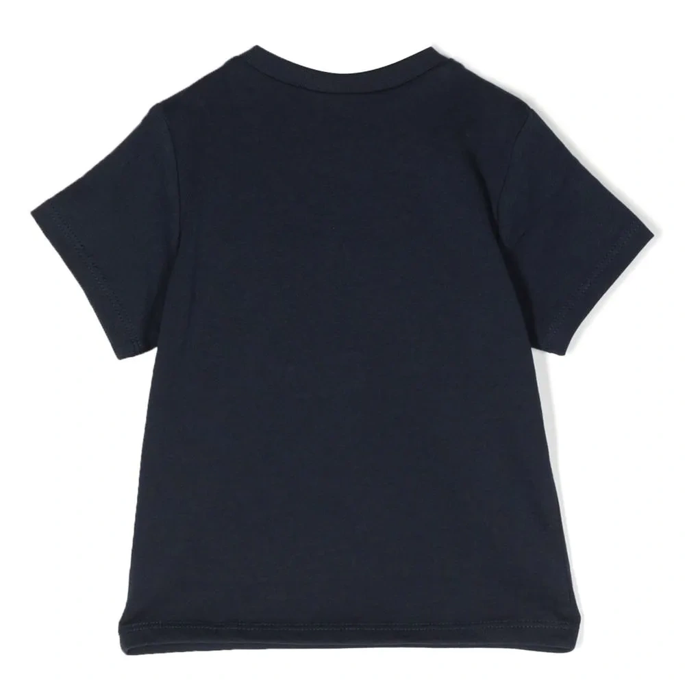 Темно-синий, хлопок, логотип спереди, круглый вырез, короткие рукава и завязки по бокам.