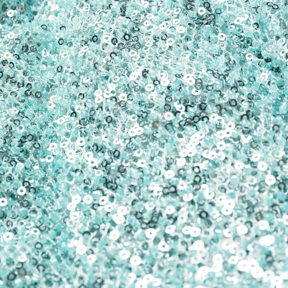 Сине-зеленый, эластичный материал, украшение из пайеток и расклешенный подол.
