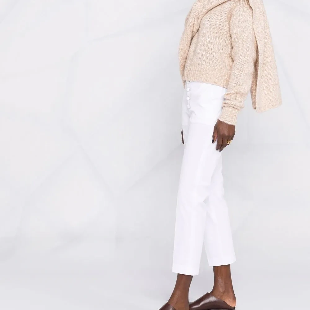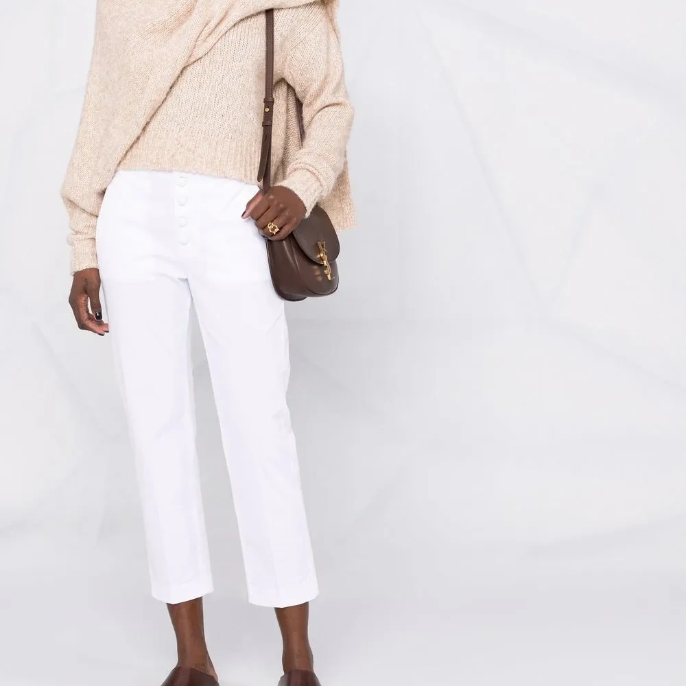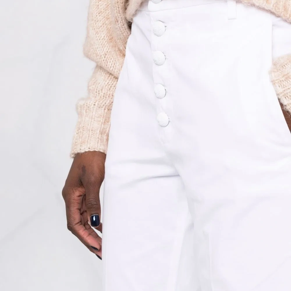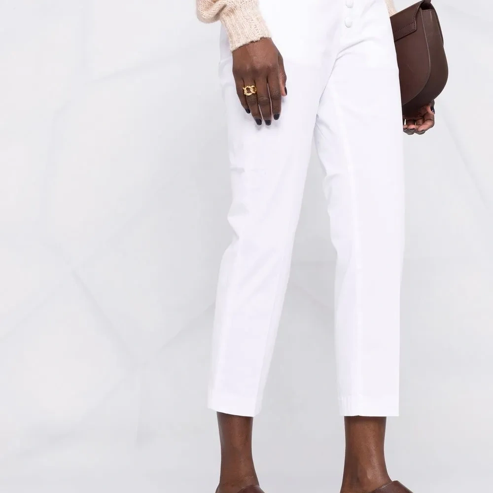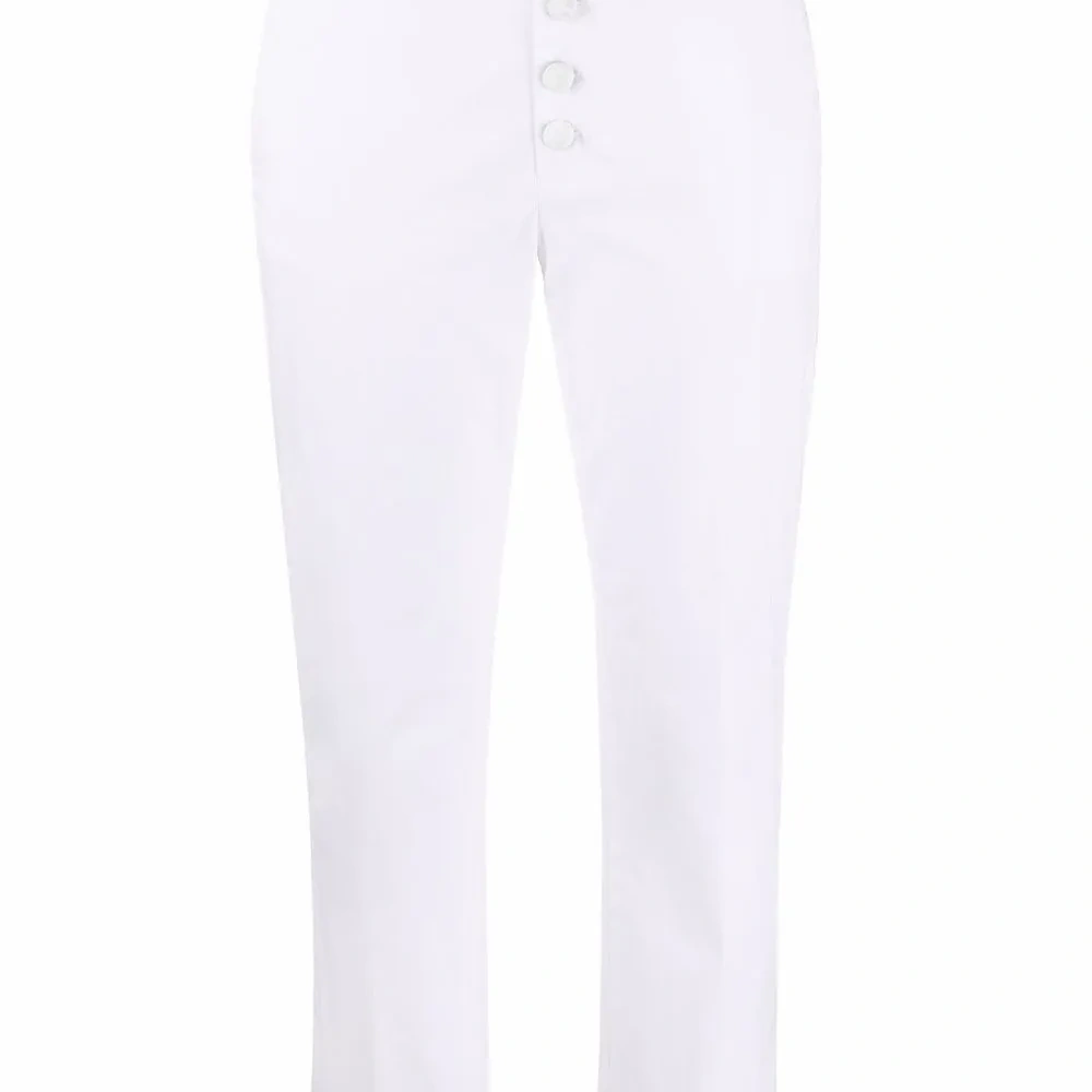 Средняя посадка, ширинка на пуговицах, петли для ремня, два прорезных кармана по бокам, два кармана с листочкой сзади, узкий крой и укороченная длина. Цвет: белый.