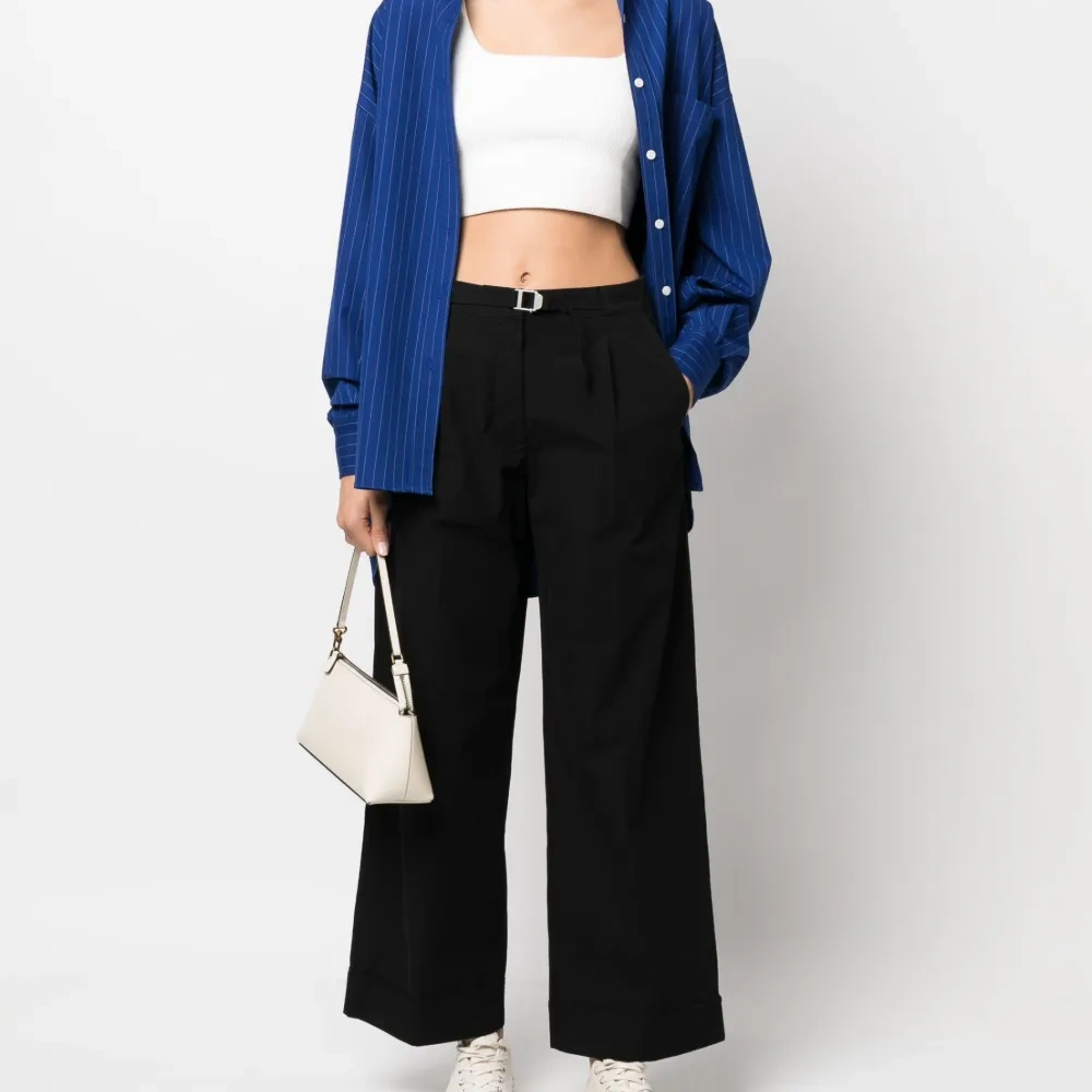 Черный, хлопок, завышенная талия, ремень на талии, широкий крой, два прорезных кармана по бокам и задние карманы с листочкой.