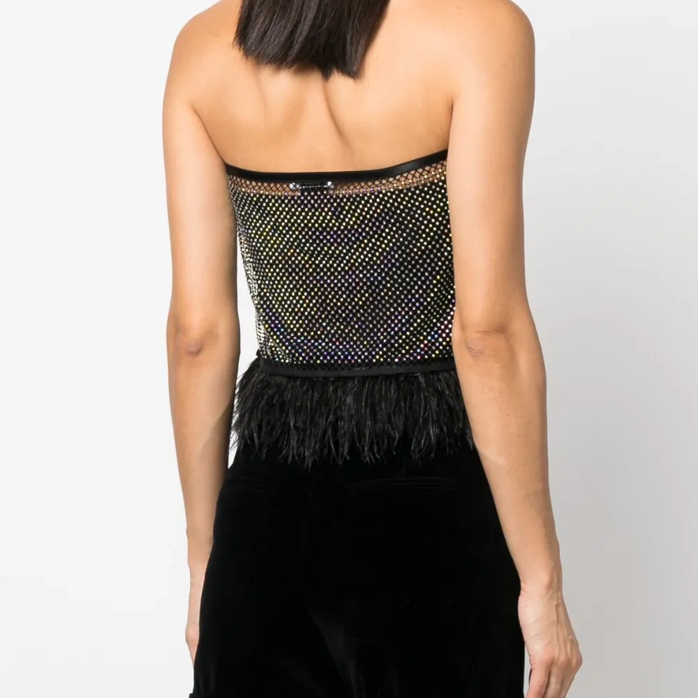 Черный, хлопок, стекло, сетчатые вставки, украшения из горного хрусталя, отделка перьями, полупрозрачный дизайн и без бретелей.