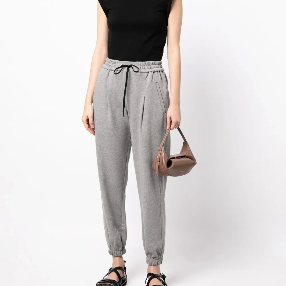 Серый, эластичный хлопок, эффект меланж, кулиска на талии, защипы, два прорезных кармана по бокам, зауженный крой и эластичные манжеты.