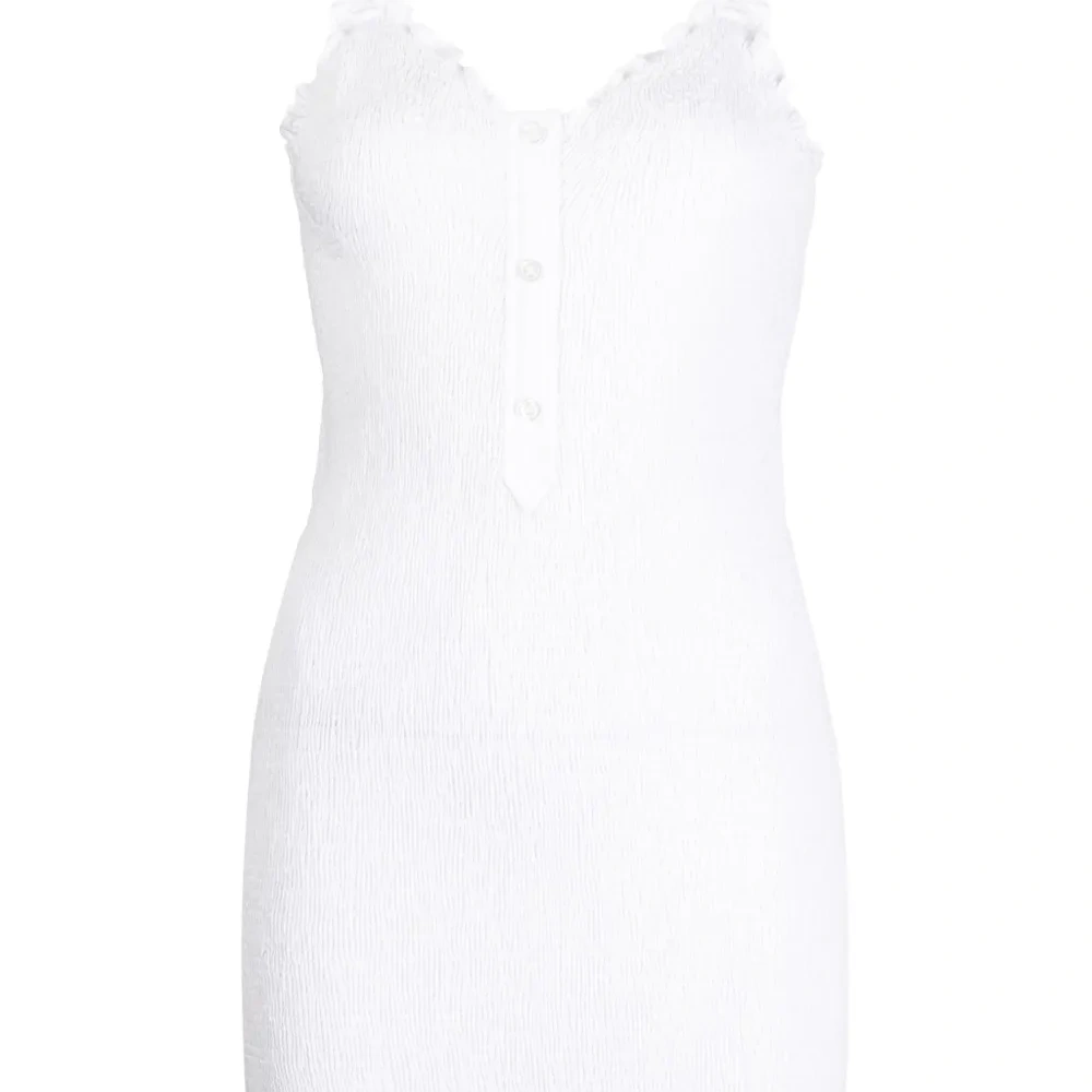 Белый, хлопок, отделка со сборками, V-образный вырез, застежка на пуговицах спереди, без рукавов, волнистые края и длина до бедер.