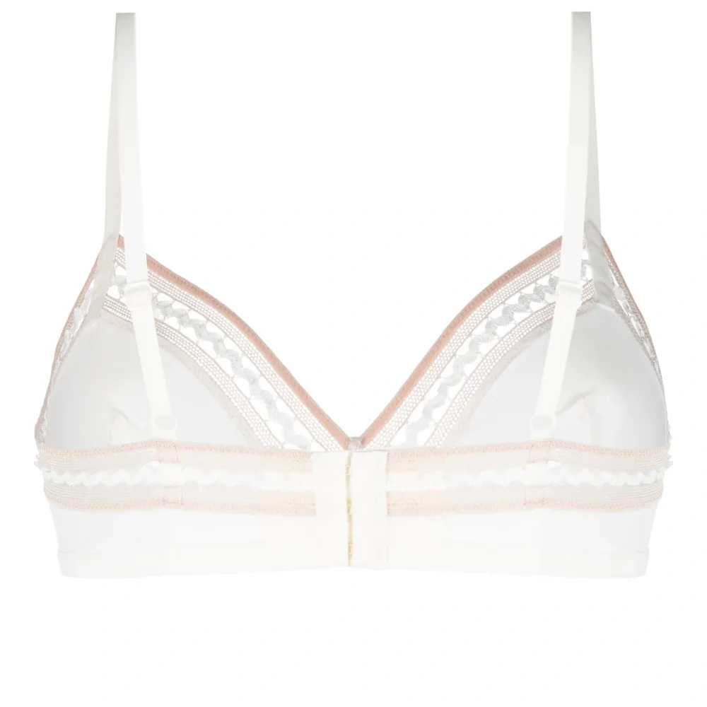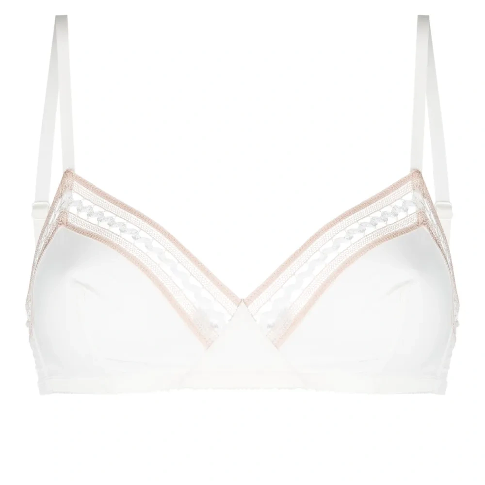 Белый, розовый, вставки из кружева, треугольная чашка, регулируемые тонкие бретели и застежка на крючок сзади.