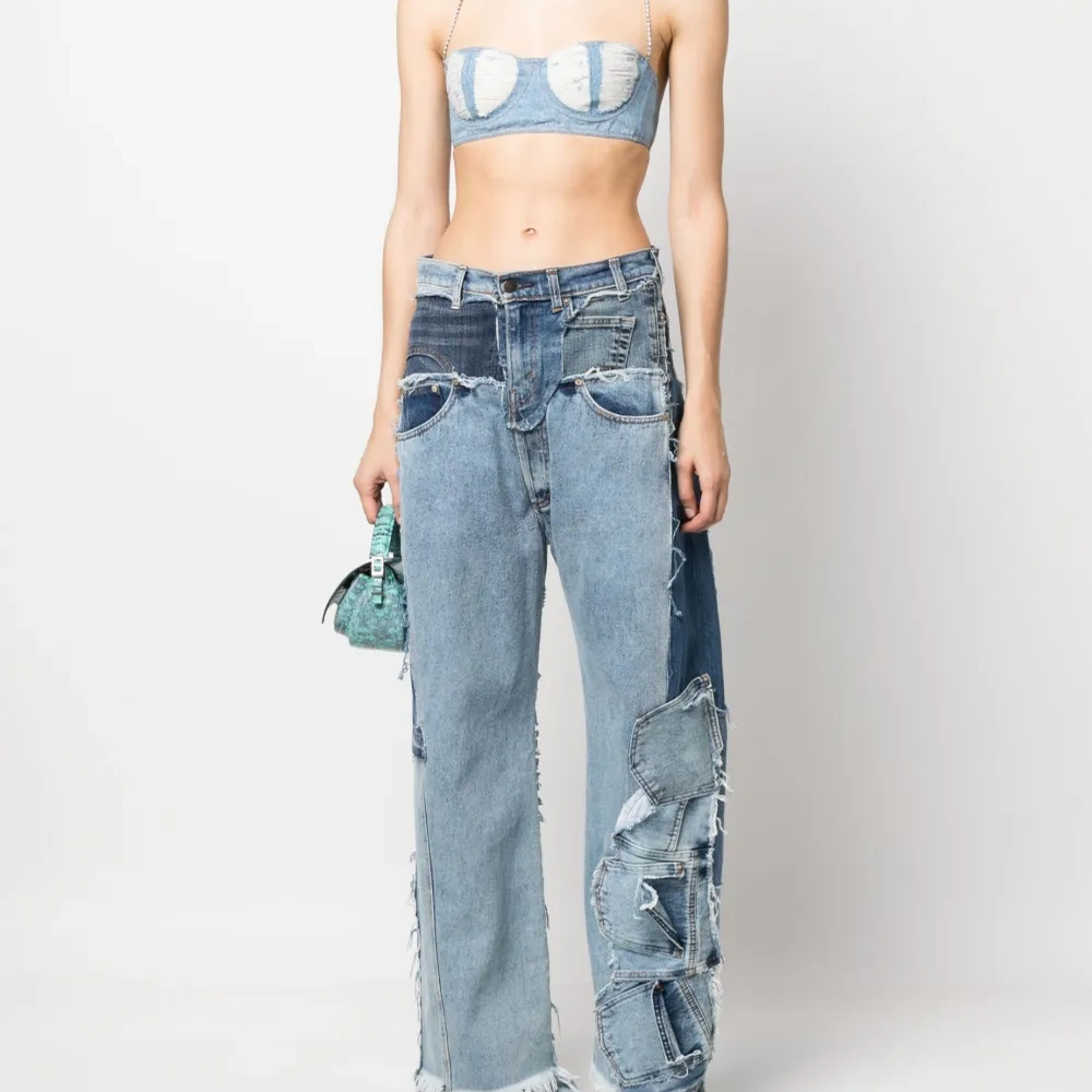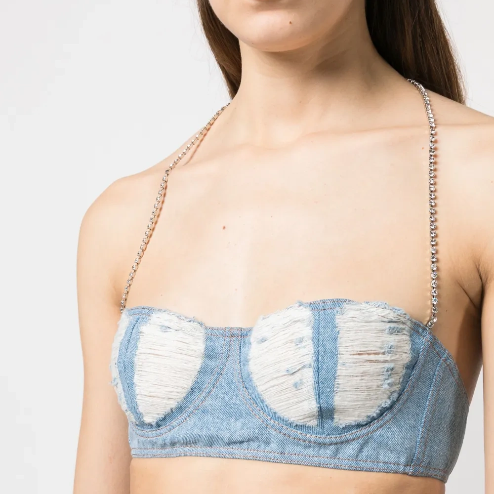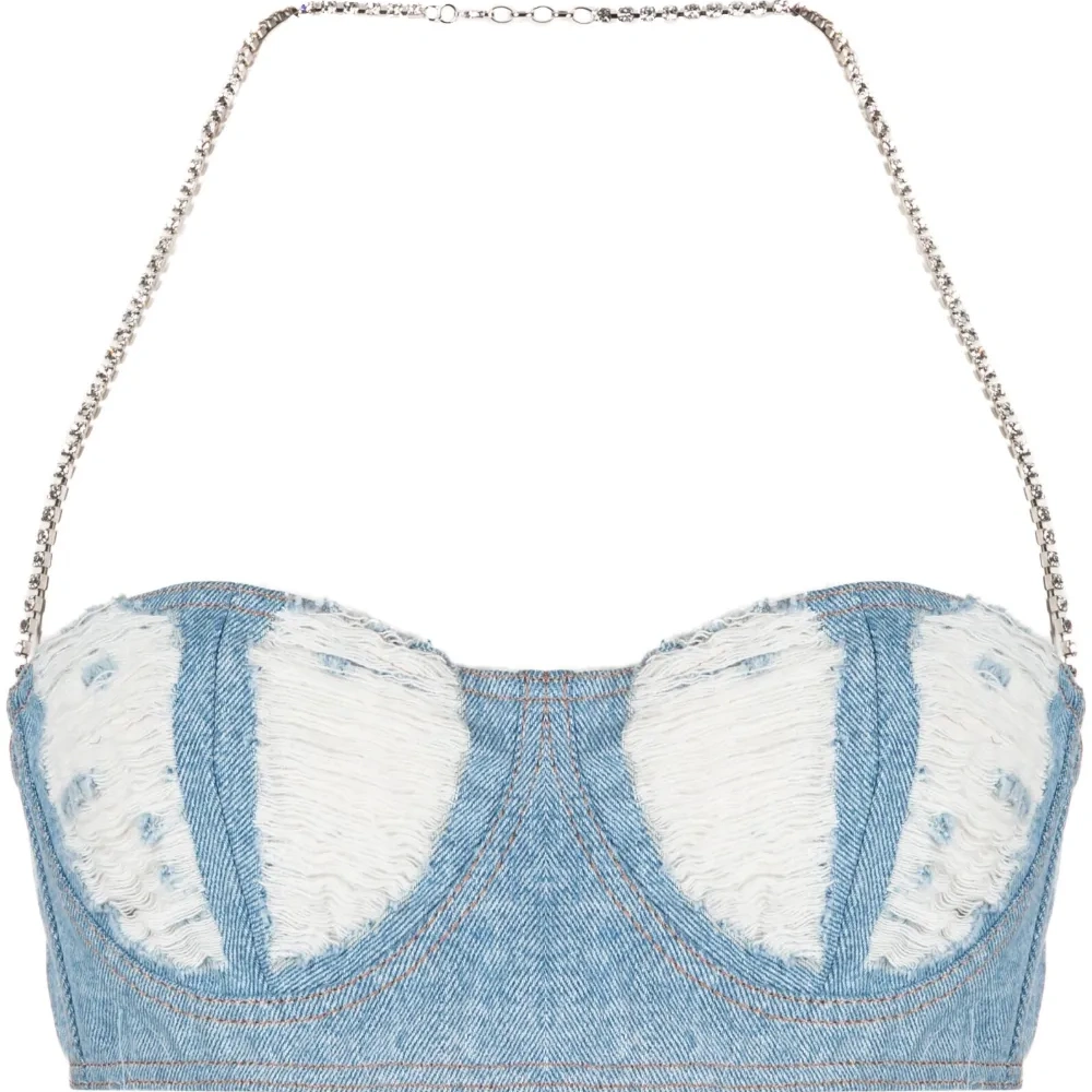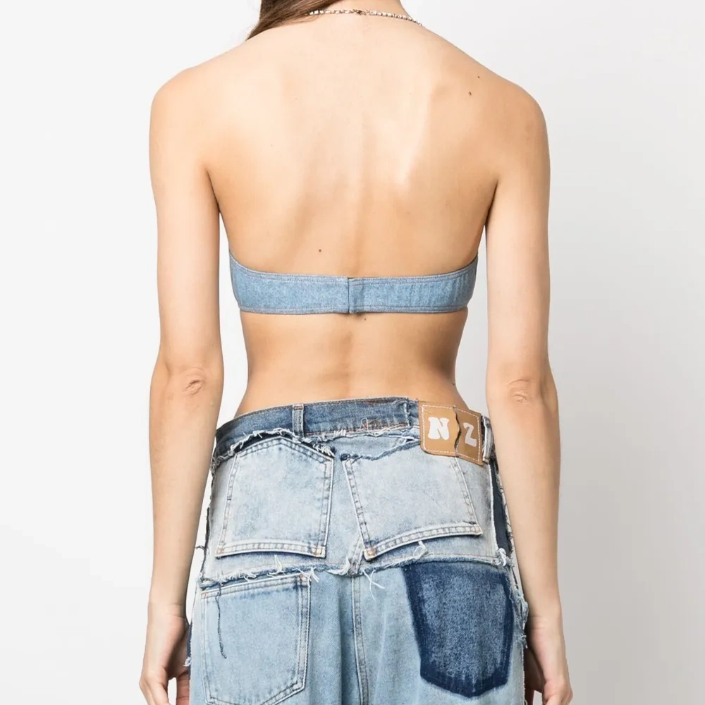 Голубой, хлопок, обработанный деним, вырез-петля халтер, цепочка, застежка на крючок сзади и укороченная длина.
