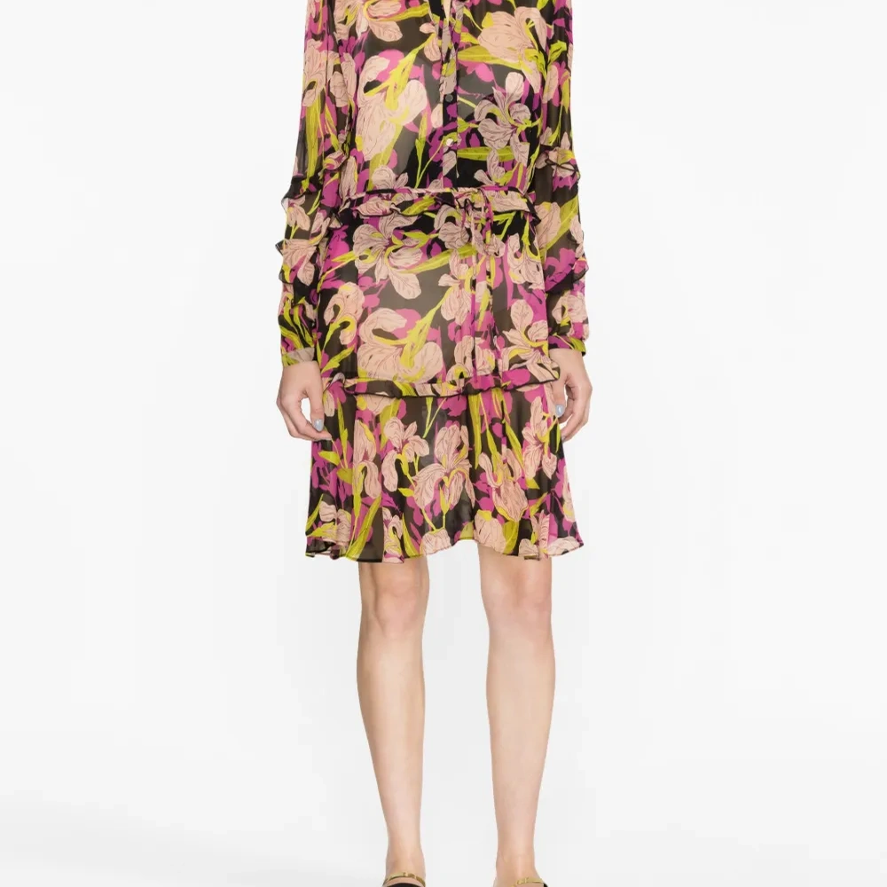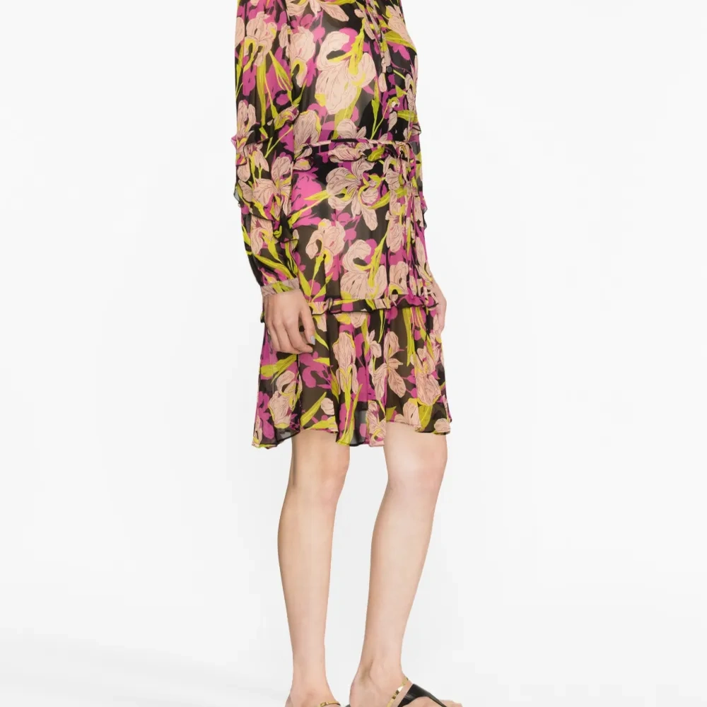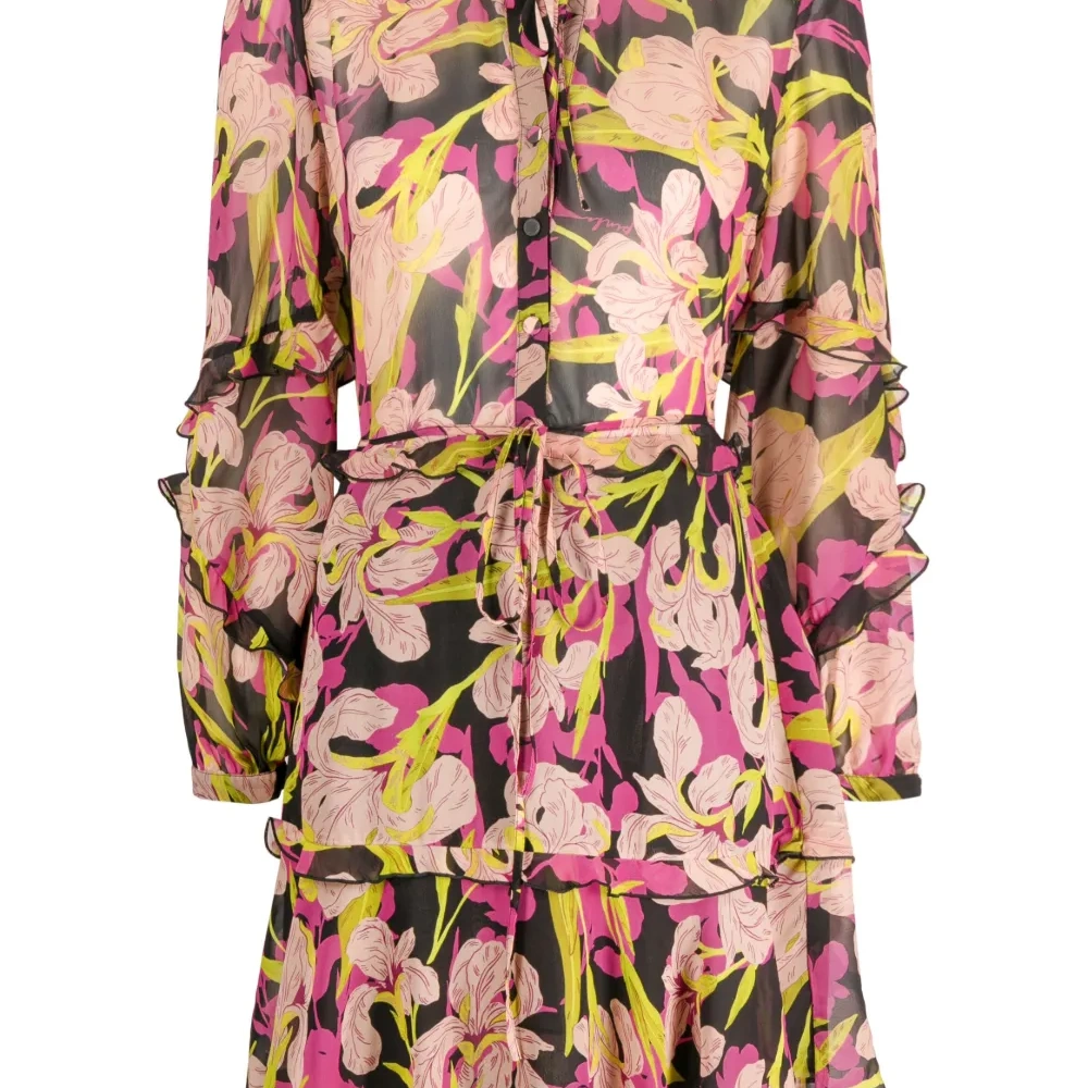 Черный/разноцветный, сплошной цветочный принт, вставки с оборками, воротник-стойка, застежка на пуговицах спереди, завязки спереди, длинные рукава, расклешенный подол и длина по колено.