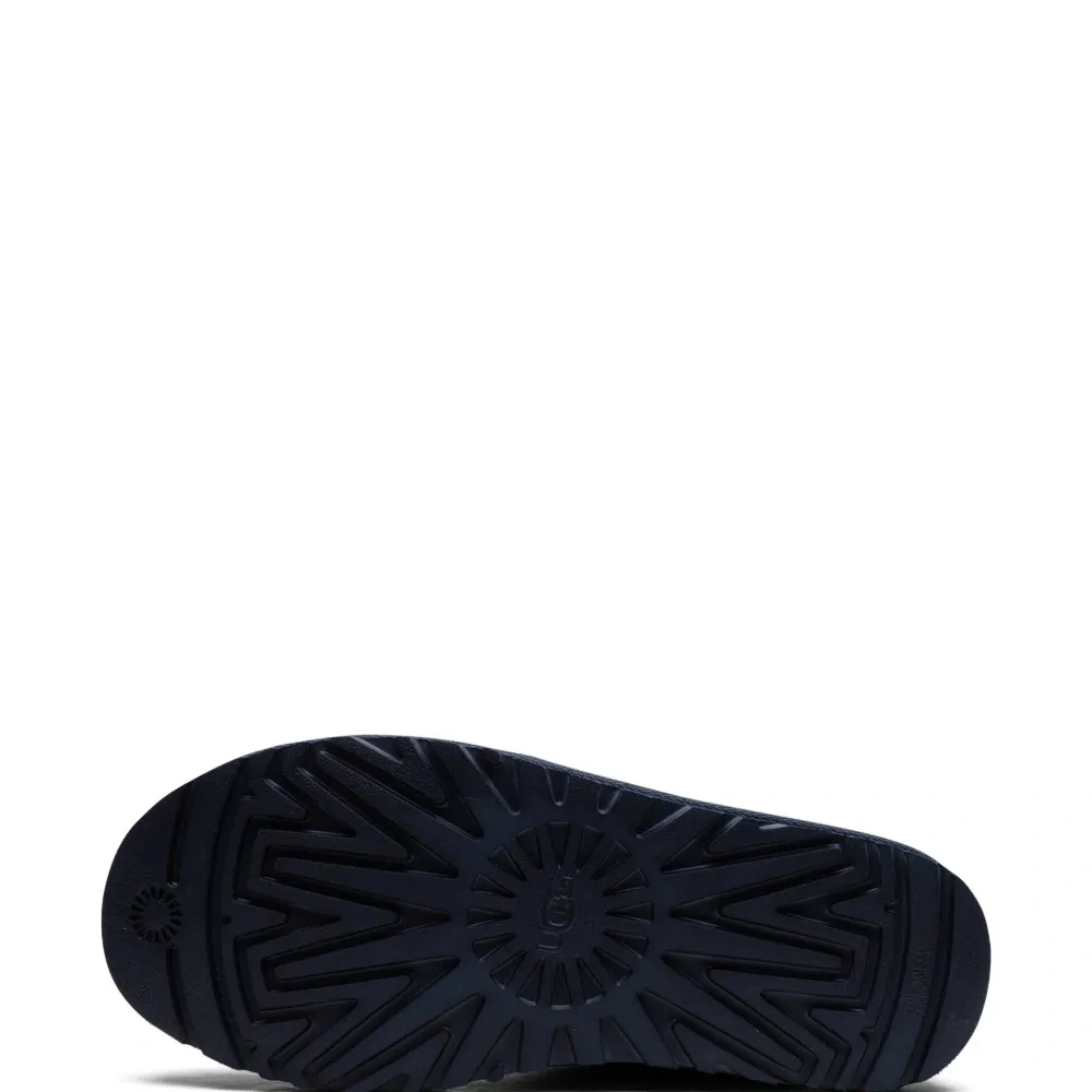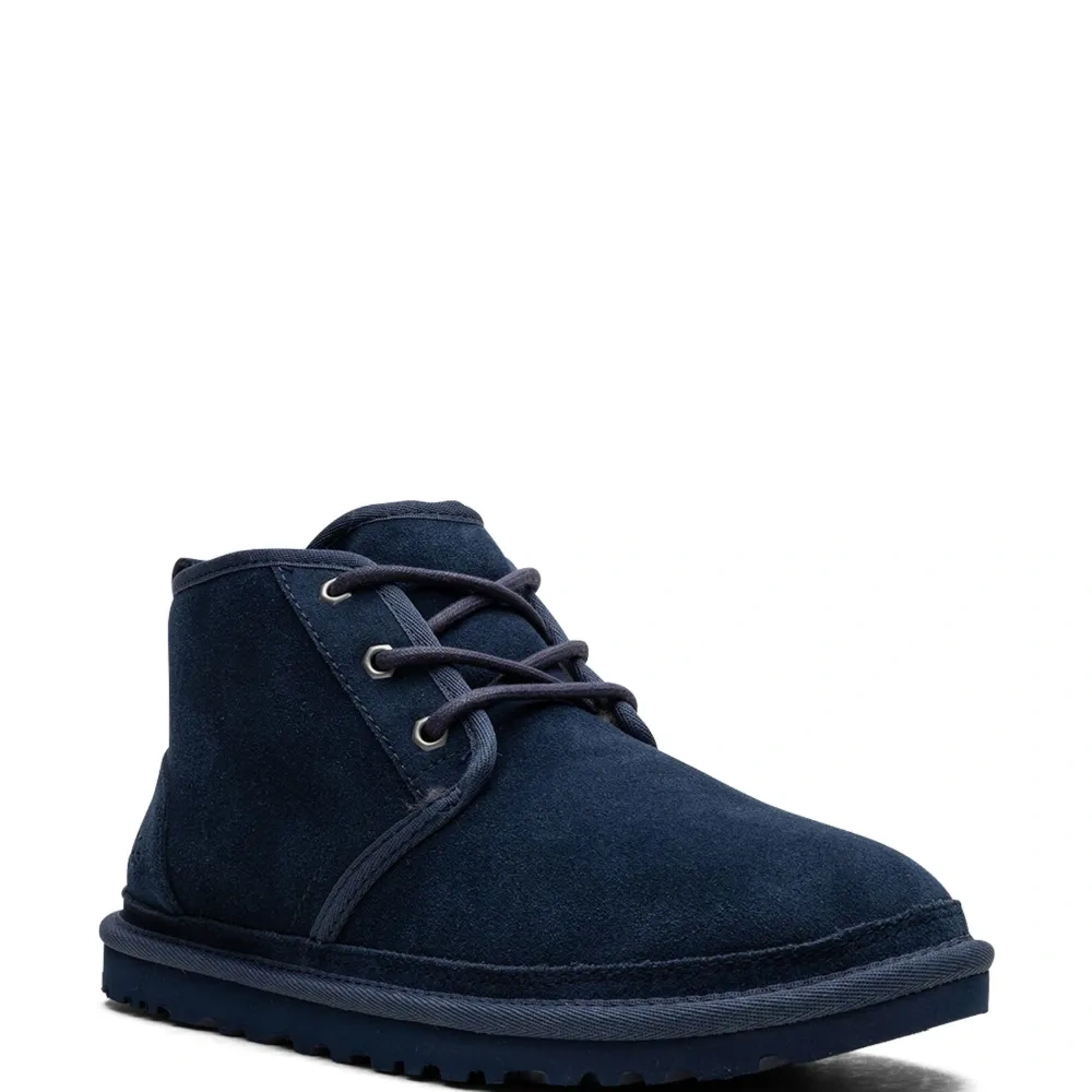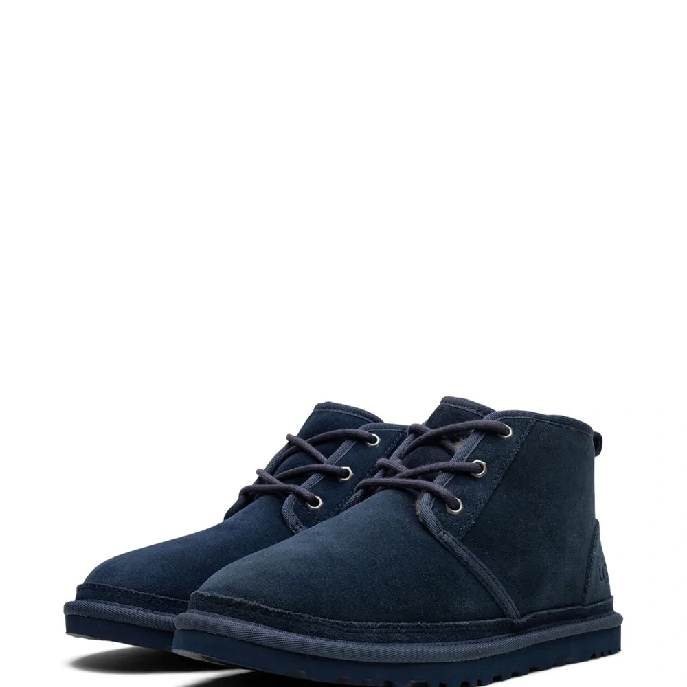 Темно-синий, замша, шерсть, тисненый логотип сбоку, закругленный носок, шнуровка спереди, петля для подтягивания сзади, стелька с логотипом и резиновая подошва.