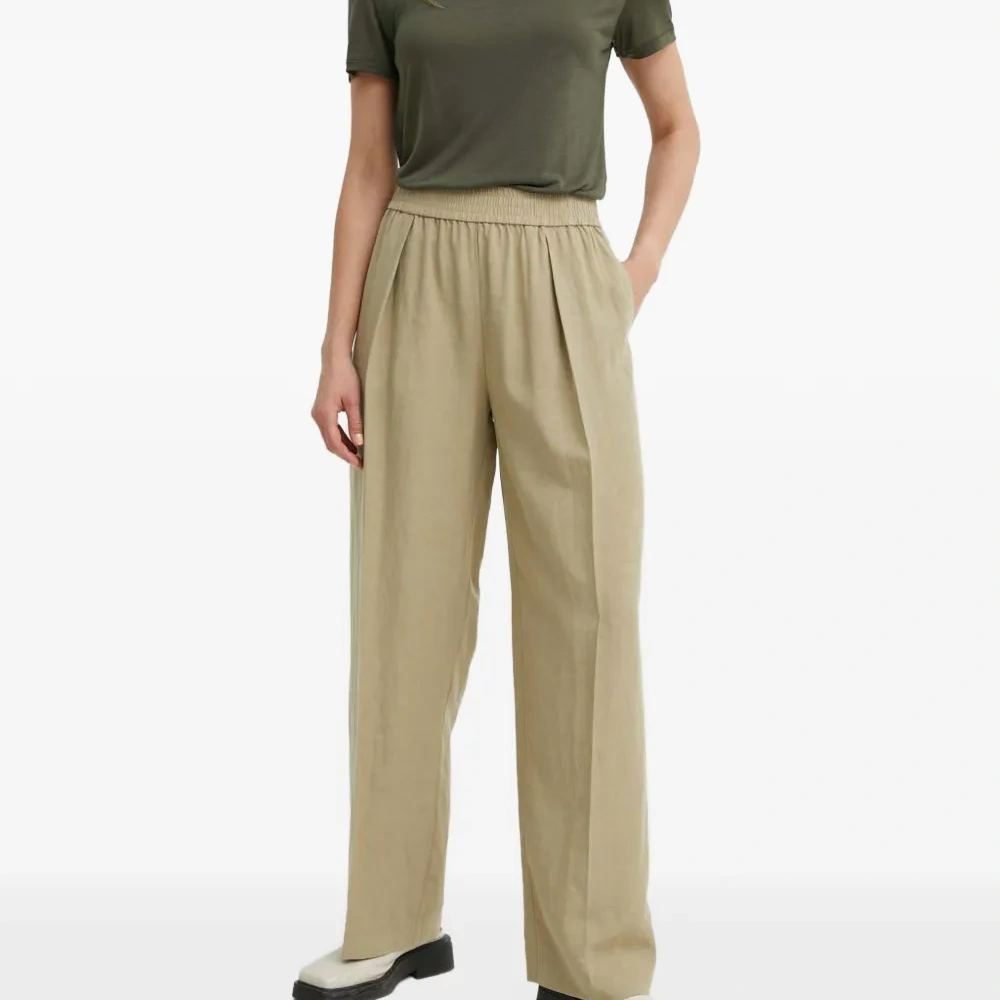 светло-коричневые широкие брюки с плиссированными деталями, эластичным поясом и боковыми прорезными карманами