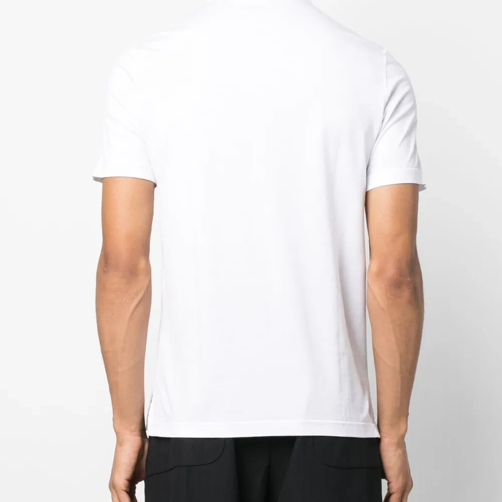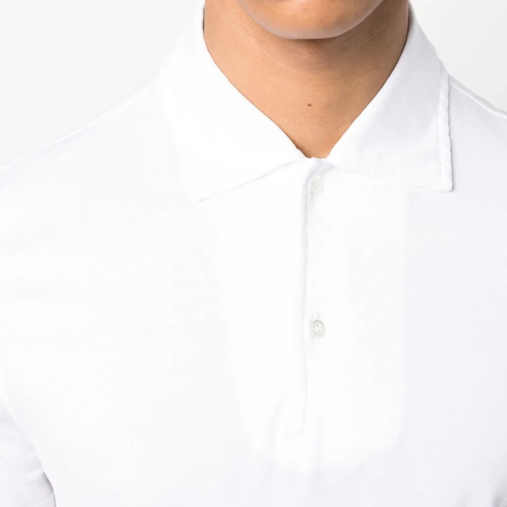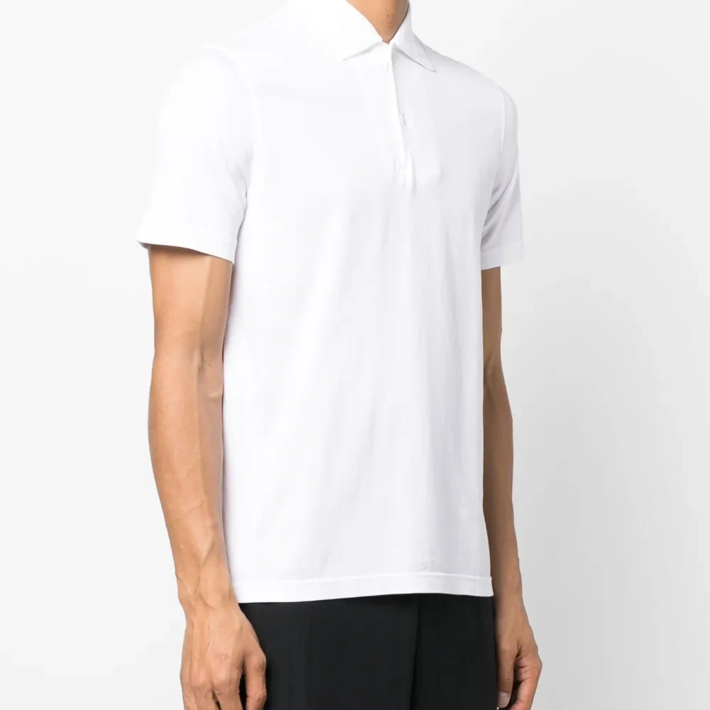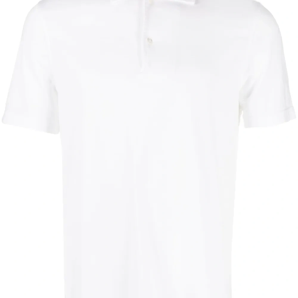 Молочно-белый, хлопок, воротник поло, планка на пуговицах спереди, короткие рукава и прямой подол.